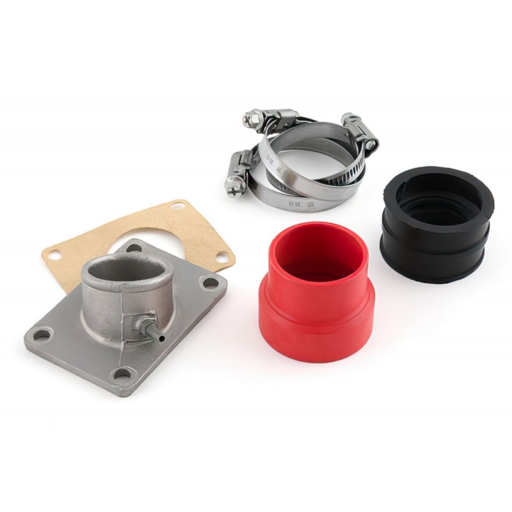 Solid mount intake manifold with vacuum port + adjustable rubber adapters for 17.5mm to 21mm Dell’Orto carburetors Derbi Euro 2 / Euro 3.Suitable for 17.5mm to 21mm solid mount Dell’Orto PHBG carburetors. Gasket and clamps are included.