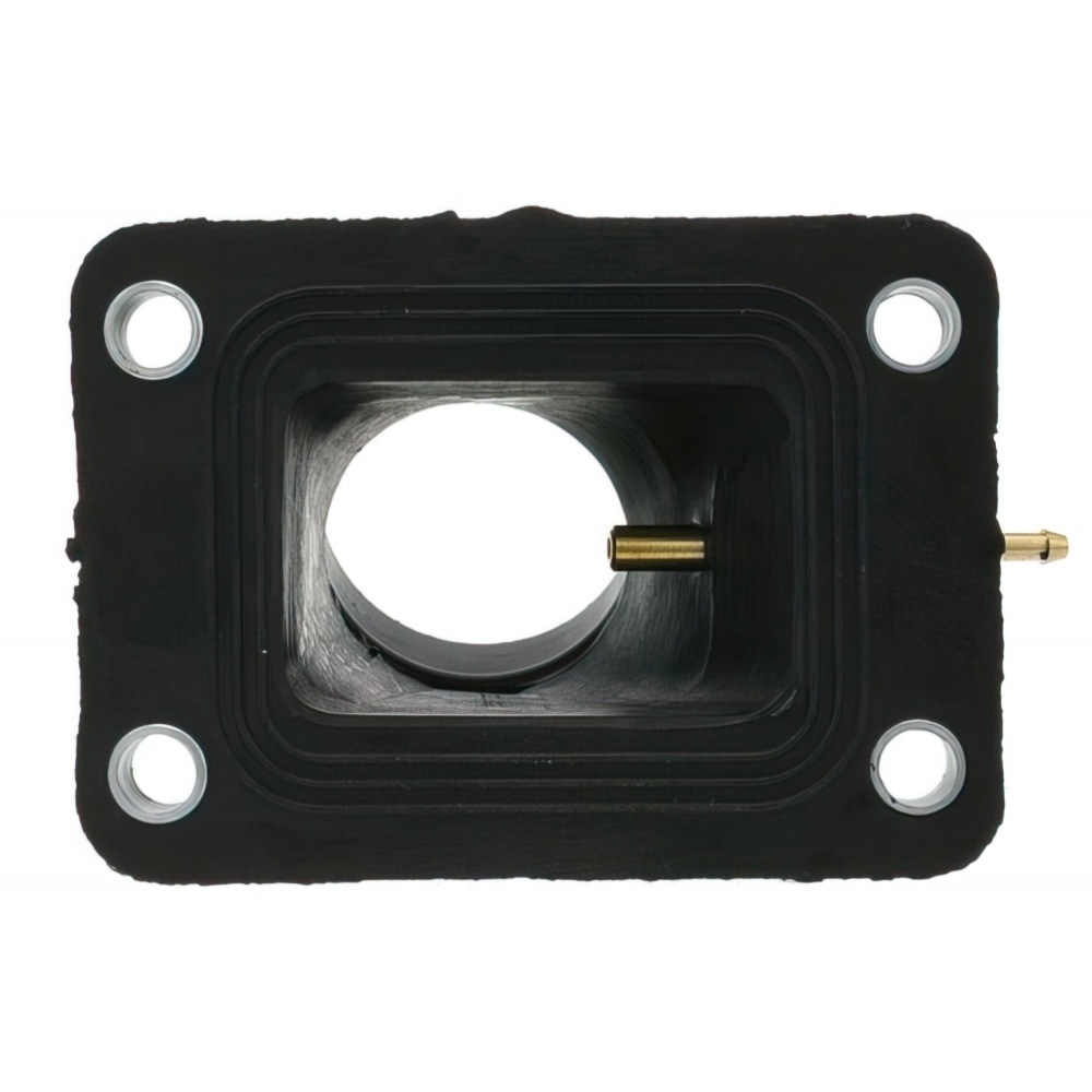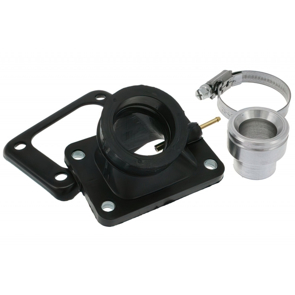 Rubber mount intake manifold for Minarelli AM6 with vacuum port by Barikit. Suitable for 24 / 28mm Dell’Orto carburetors. An adapter allows switching to solid mount.