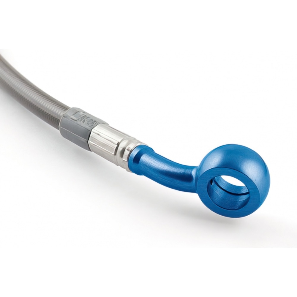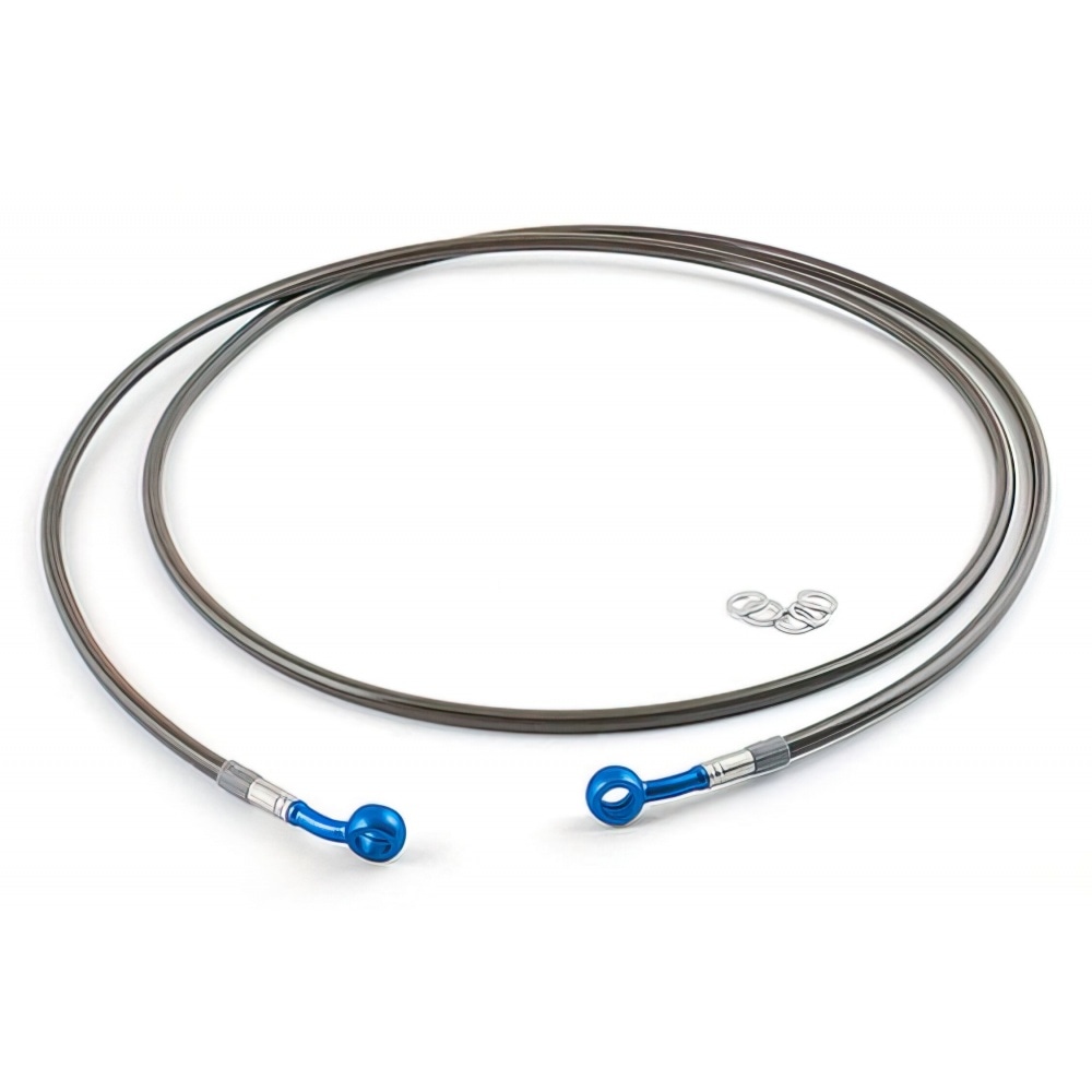 Motacc Brake Hose (front) MBK Nitro / Aerox carbon w/ blue banjo fitting - braided stainless steel brake lines for maximum braking performance - and to add a sleek racing look to your bike.