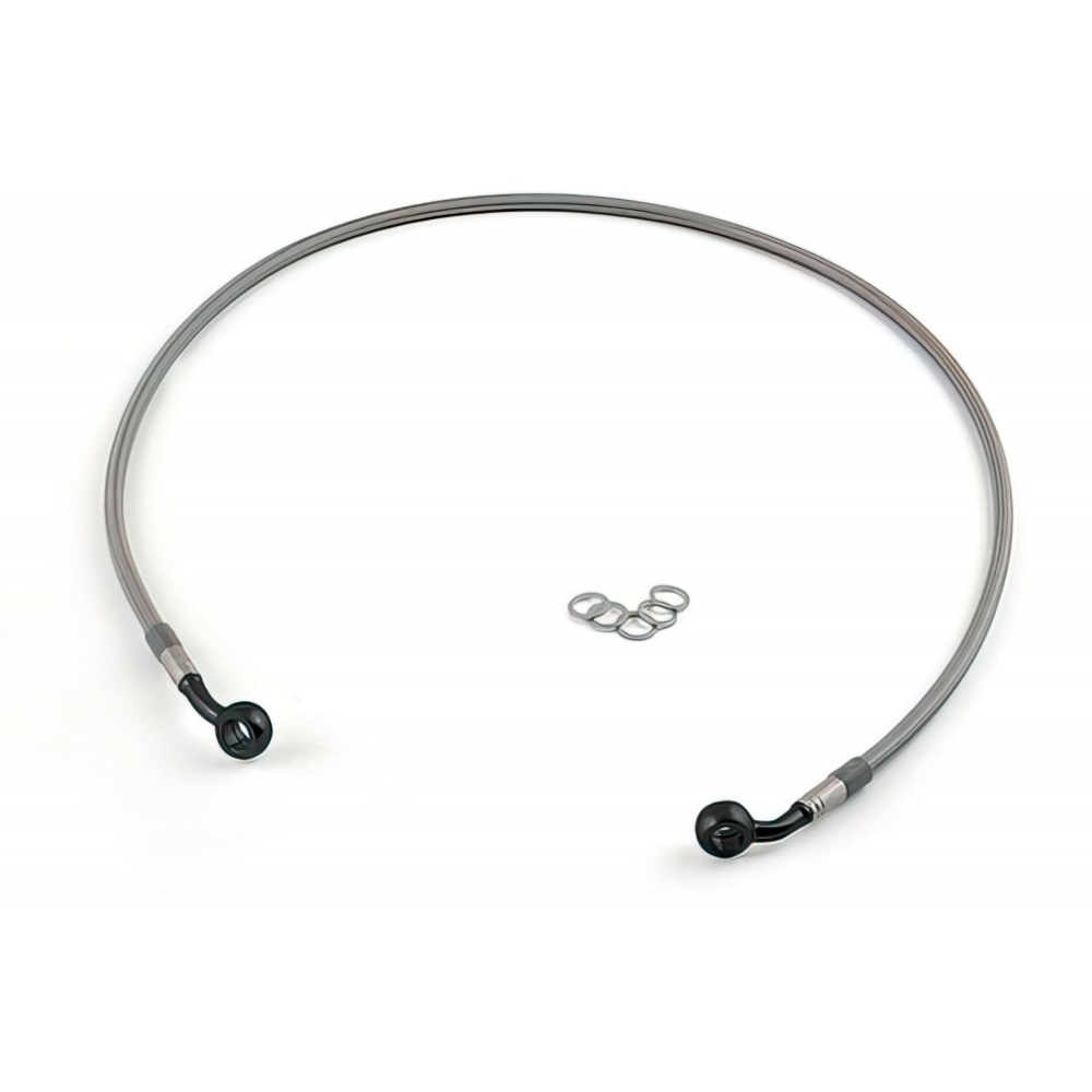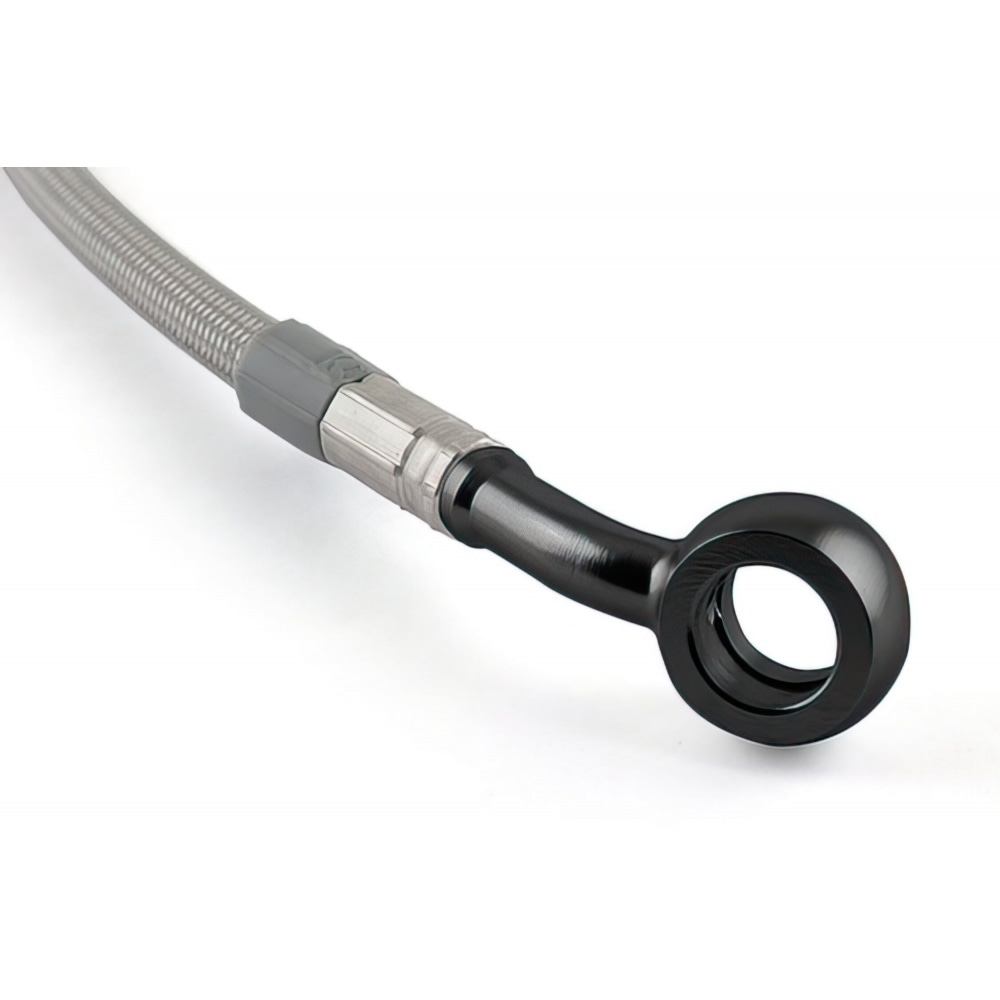 Motacc brake hoses are composed of a PTFE inner tube covered by a flexible stainless steel jacket. The hose is again covered by a transparent PVC coat. The banjo fittings are made of anodized aluminium; as they are freely rotating, mounting the hoses is very easy.