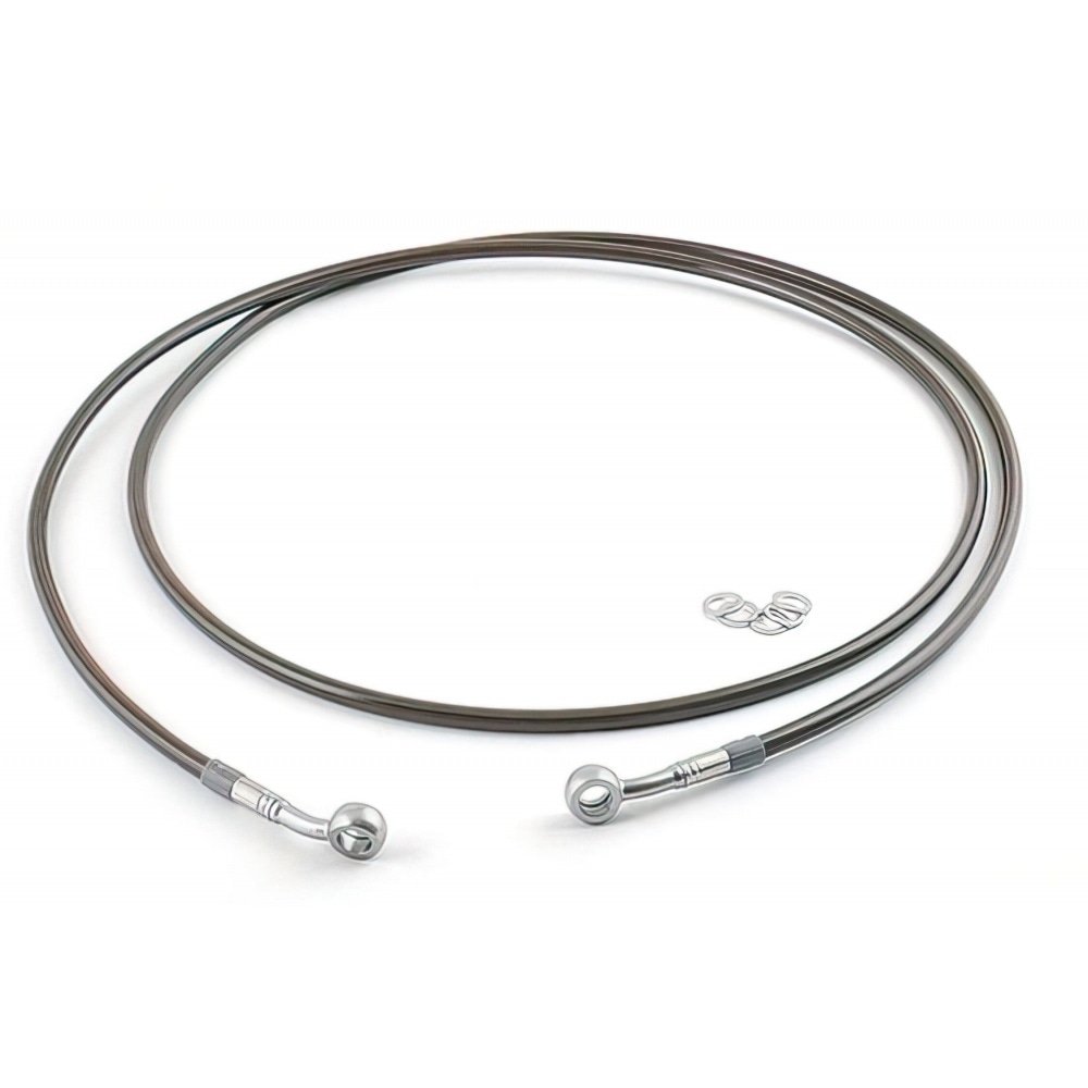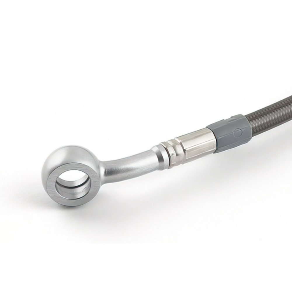 Motacc brake hoses are composed of a PTFE inner tube covered by a flexible stainless steel jacket. The hose is again covered by a transparent carbon-look PVC coat. The banjo fittings are made of anodized aluminium; as they are freely rotating, mounting the hoses is very easy.