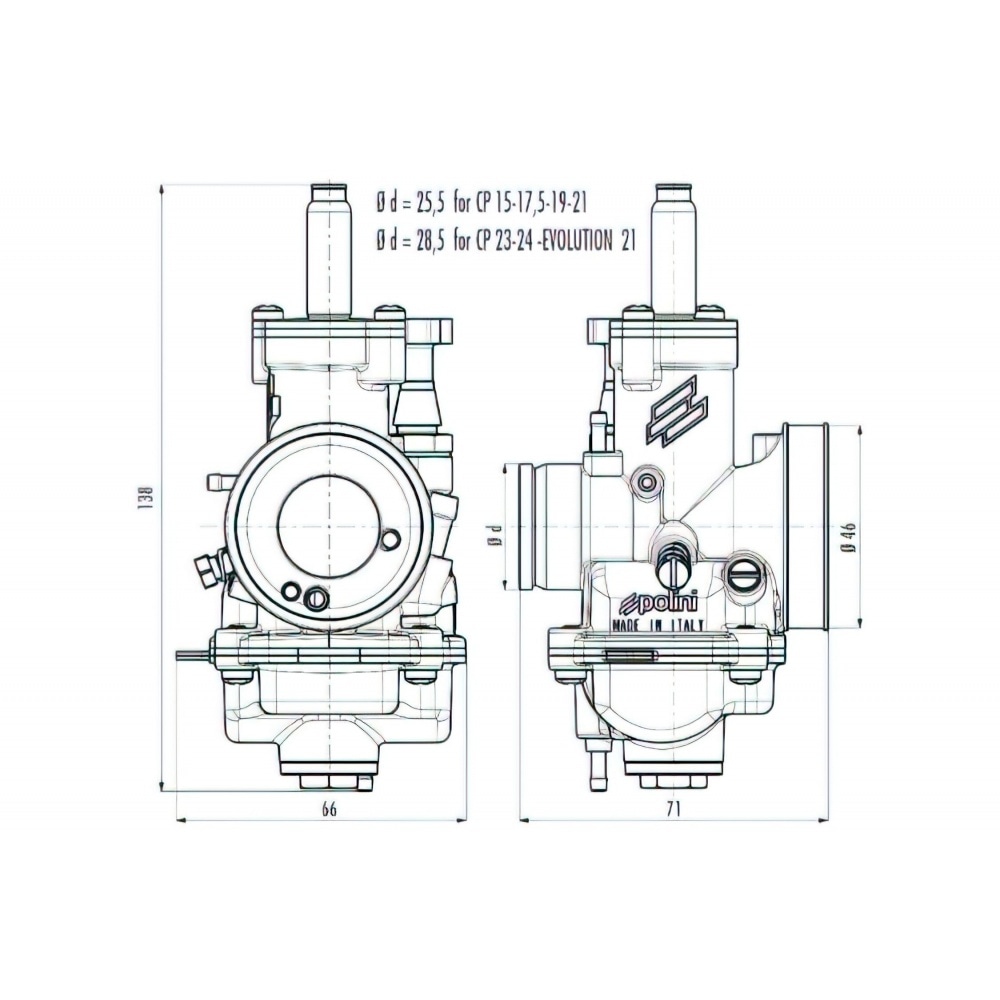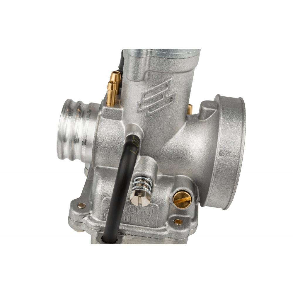 The overall design and performance of the carburator was checked and revised to ensure maximum reliability, make adjustments as easy as possible and, most of all, make it more fuel efficient.Mounting the carb was kept simple, too, as Polini used the same connections and measurements as the standard Dell'Orto carbs.