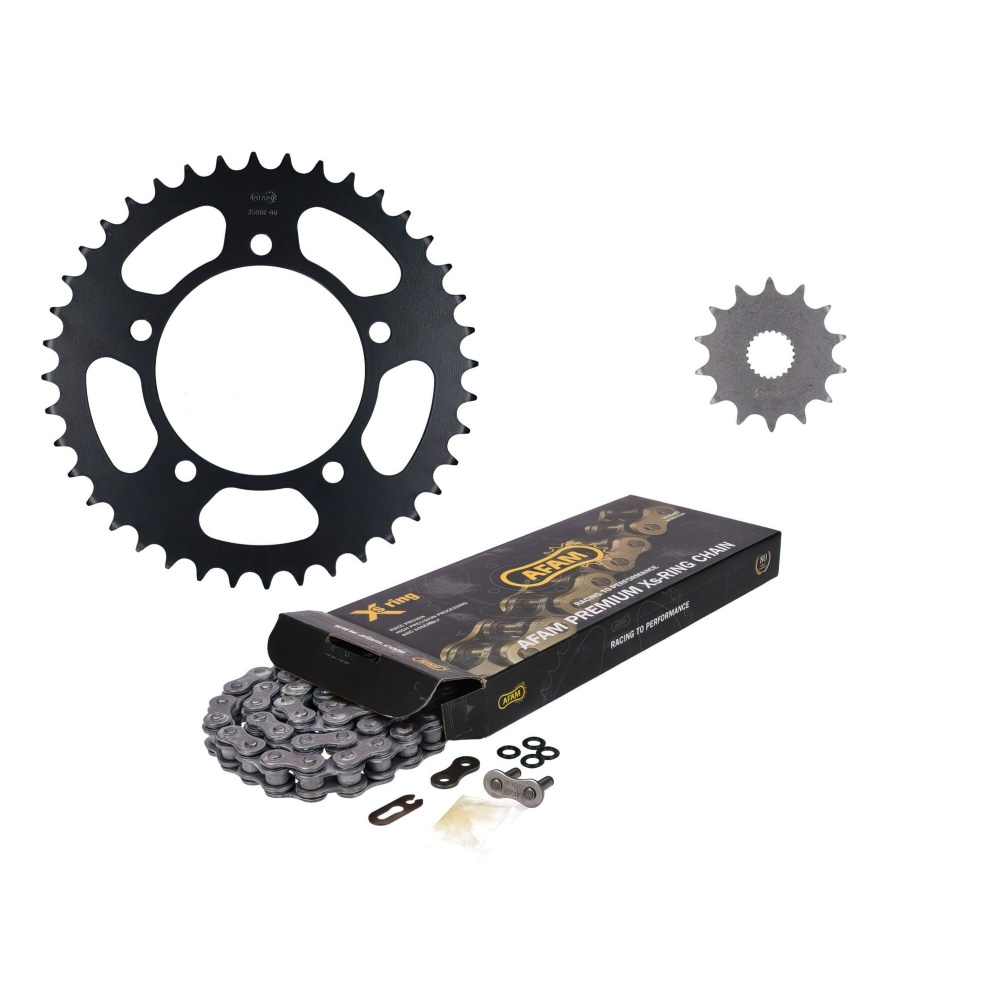 Chain Kit AFAM 17×40 Aprilia RS125 1 2006 – 2010, very high quality kit from Afam, renowned specialist for chain drives. This chain kits lets you replace all worn parts of your original chain drive or change the gear ratio.