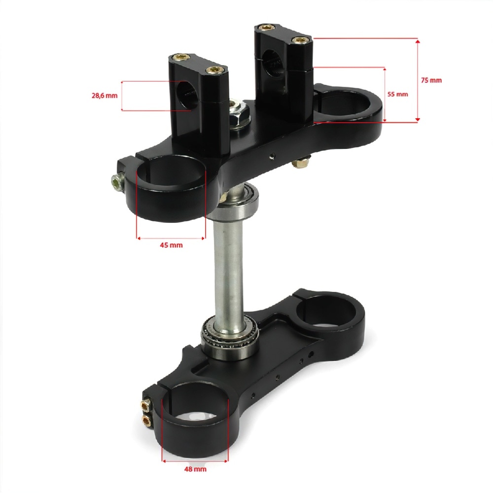 Triple Tree 45/48mm – d.28.6mm Pit Bike / Dirt Bike black,die-cast aluminum triple clamp. The upper triple clamp allows 3 different handlebar positions. The precise fork holes ensure a perfect alignment of the fork.