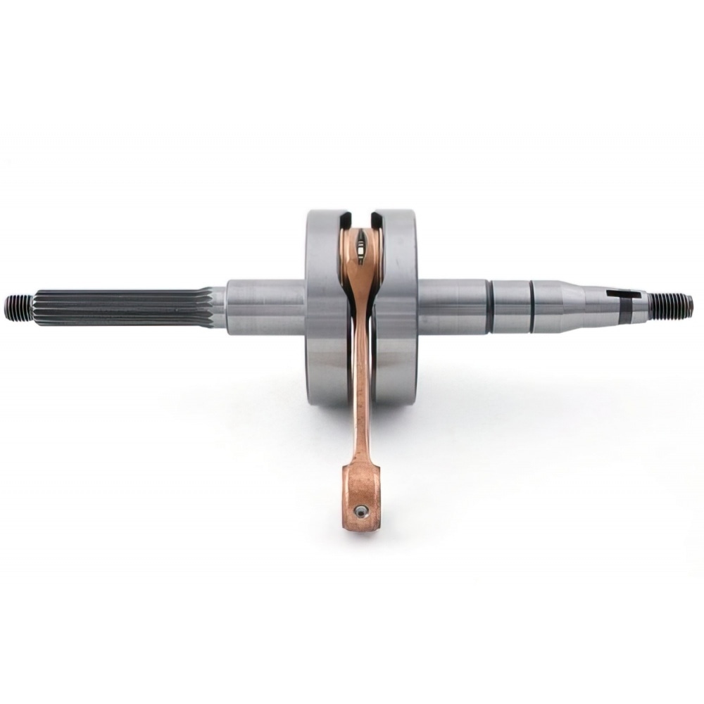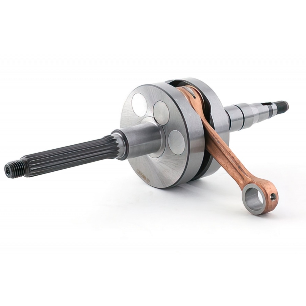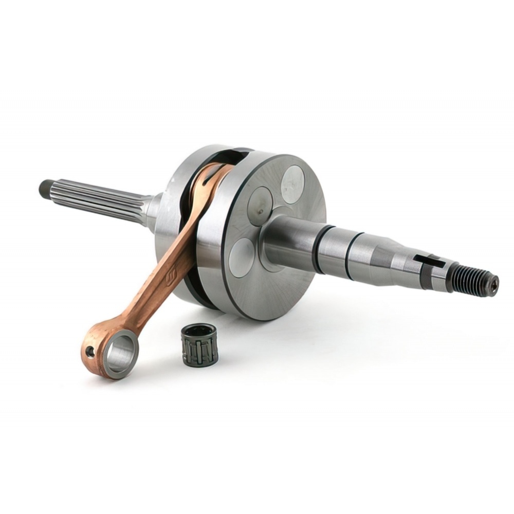 Full-circle crankshaft for higher primary compression with reinforced connecting rod for 10mm piston pin; a small end bearing is included. Ideally suited and recommended for use with 50cc and 70cc sports cylinders.