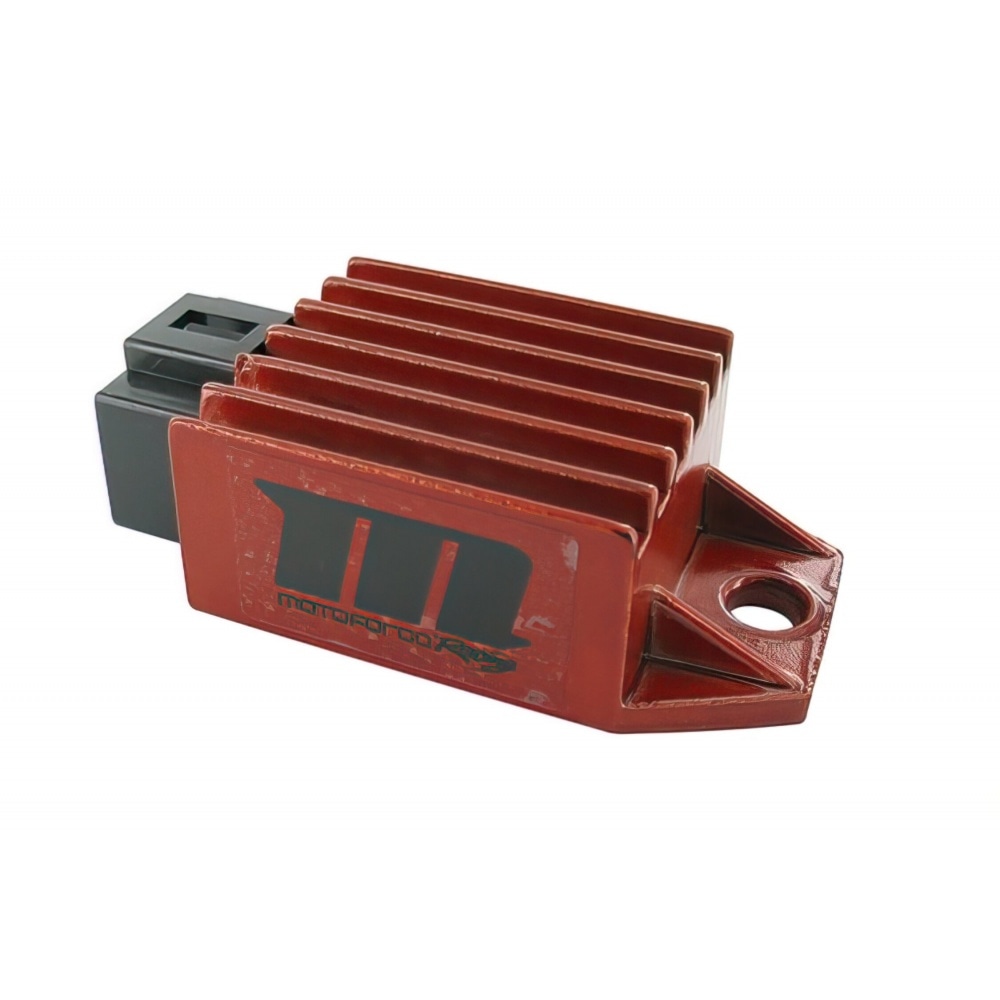 This rectifier/regulator works on the same principle as the racing ignition coil. By achieving a more effective transformation of the voltage from the original stator, this unit achieves a much higher secondary voltage as compared to the original part. The charging voltage itself stays on the same level as the original unit, i.e. between 12.6V and 14.75V, while the output is higher (100W).