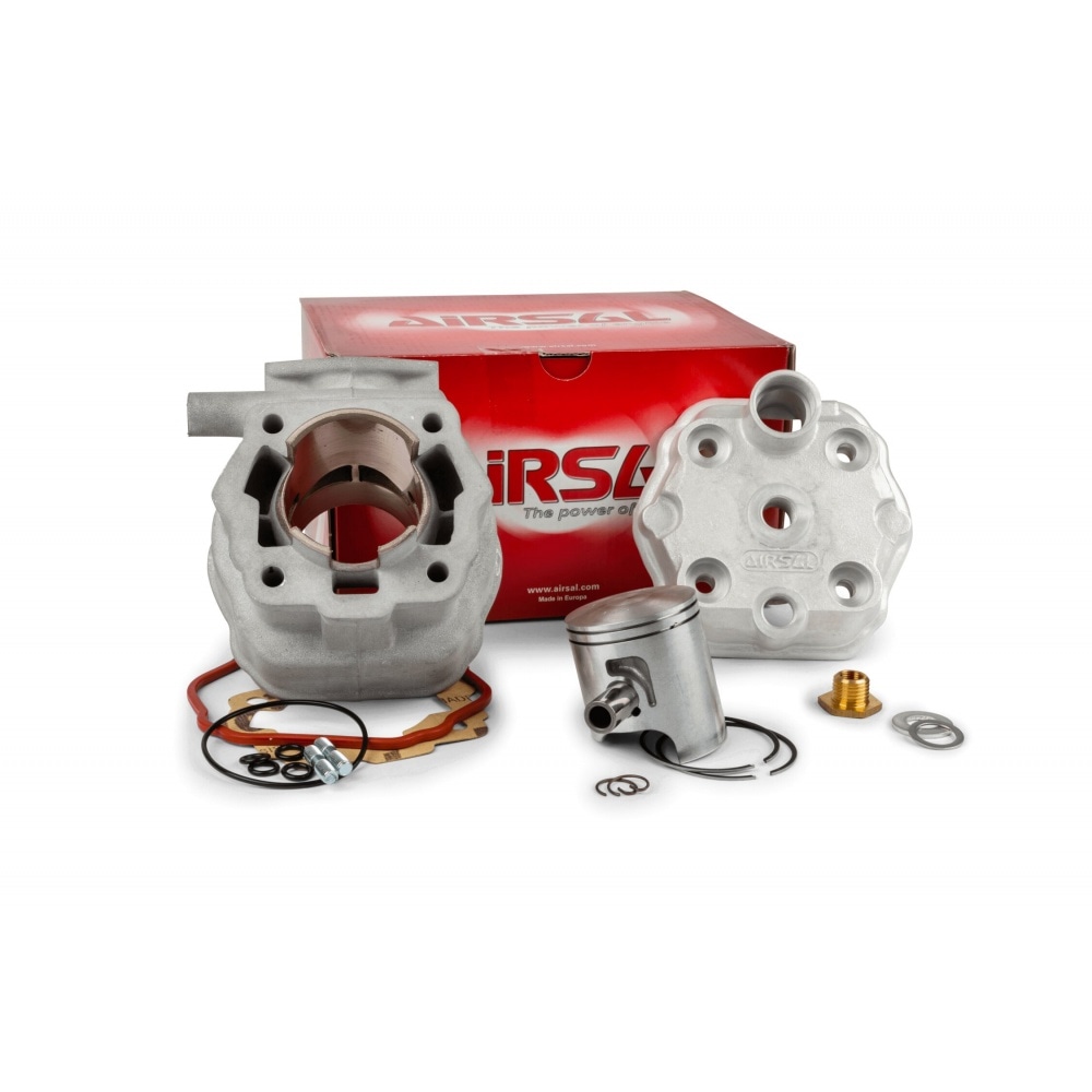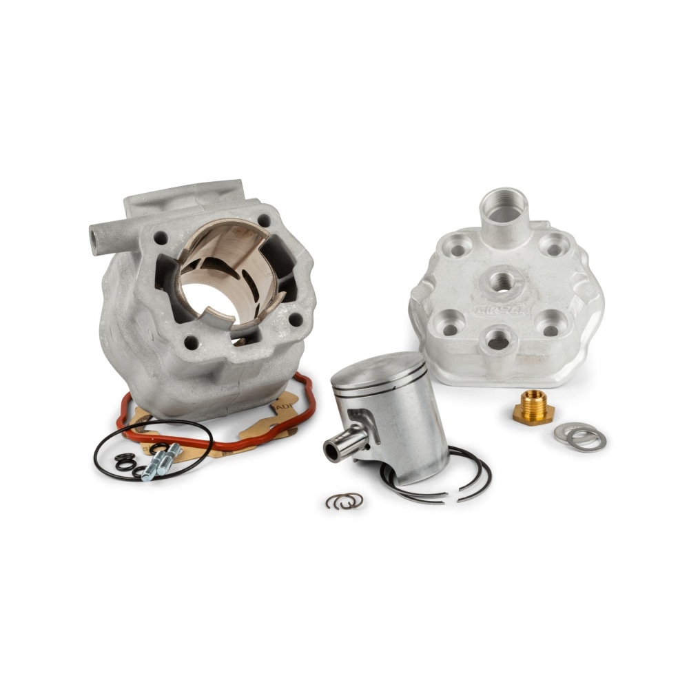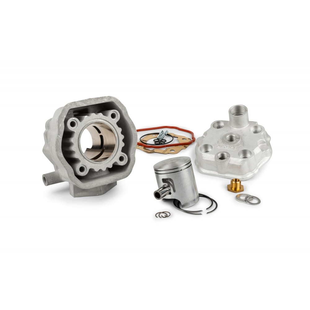 This racing kit includes a 48mm (Big Bore) Nikasil-plated aluminium cylinder with bridged exhaust port, a piston (d=48mm, two rings), a cylinder head (high-compression) and gaskets for mounting (especially for adjusting "squish clearance").