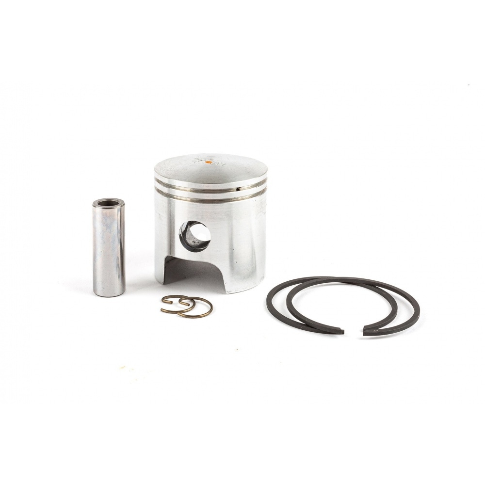 The cylinder kit is made of aluminium, with 4 transfer ports (T4), an oval exhaust port and a two-ring piston. With a 47mm piston diameter, it will give you a 77cc displacement. A cylinder head is not included, so you can simply keep the original one, but it will have more power with a high-compression cylinder head (47mm).