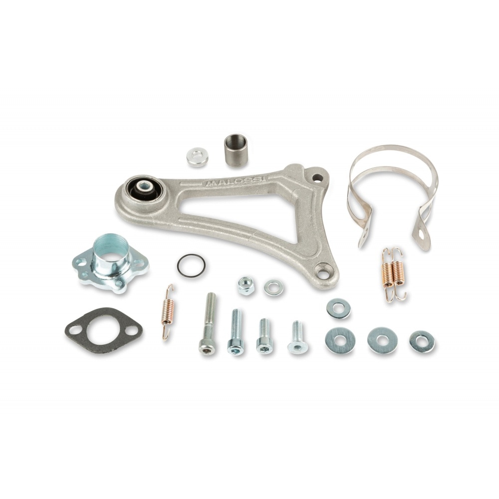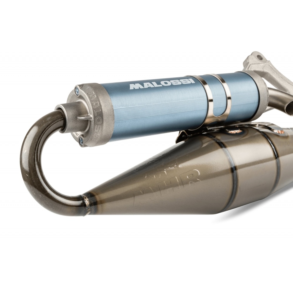 Racing exhaust from Malossi for Yamaha Jog, Malaguti F10 / F12 and other 50cc scooters with Minarelli horizontal engine. Including aluminum silencer in blue/grey. The exhaust is designed for the 70cc MHR racing cylinder , but also fits all other 70cc racing cylinders.