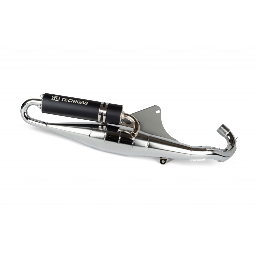 Tecnigas Exhaust RS, Piaggio Maxi 125/150/180, chrome. The RS is a tuning exhaust designed to enhance the performance of 2-stroke maxi scooters, with noticeably more power than the stock exhaust. It is hand-made and features a classic welded expansion chamber made of several cones. Perfectly suited to original or close to original set-ups and cylinders. The body is chrome-plated so the exhaust looks extra-classy and is less susceptible to rust. The silencer is black.