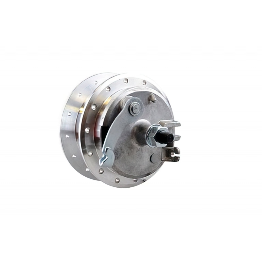 Front Wheel Hub axle 12mm - 28-hole rim Peugeot 103 Leleu, wheel hub for models with Leleu wheels. For 12mm axle and 28-hole rims.The hub is identical to the original part, so simply take down the old hub, install the new one, and your wheels will work like new.