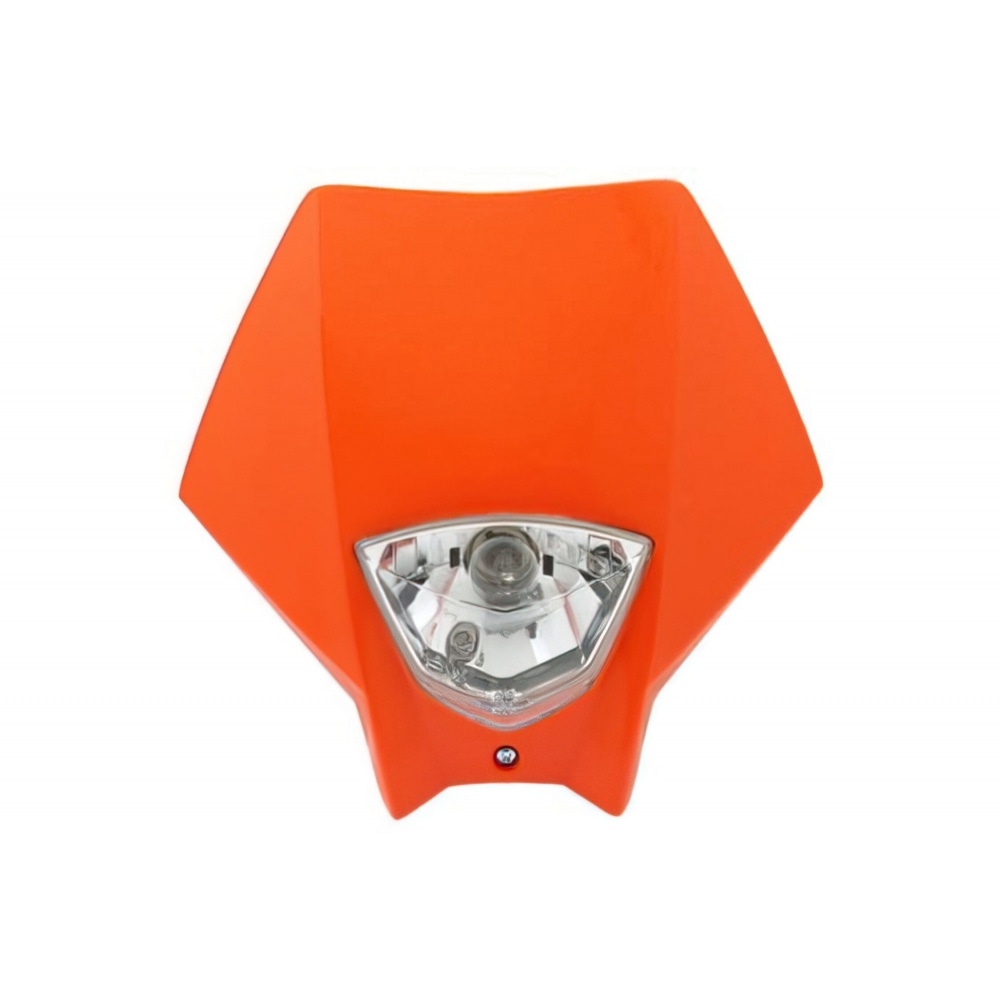Great new look for the front of your motocross bike / supermoto: Headlight Mask Master Orange.The headlight features 2 bulbs - the upper, brighter one for riding at night, the one underneath acts as a parking light. The motocross style mask looks great, not too flashy but clean and stylish.