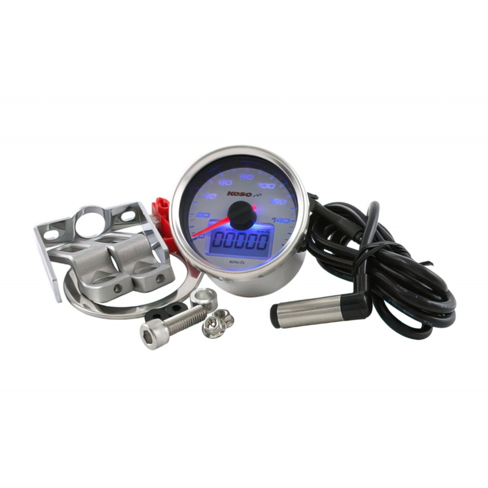 Koso has long been well-known among scooter and moped fans for their HQ electronic equipment, gauges, CDIs, accessories and more. This is aKoso Speedometer D55 GP Style 160 km/h with chrome case, white face and blue lighting, round analogue speedometer plus odometer and trip meter.