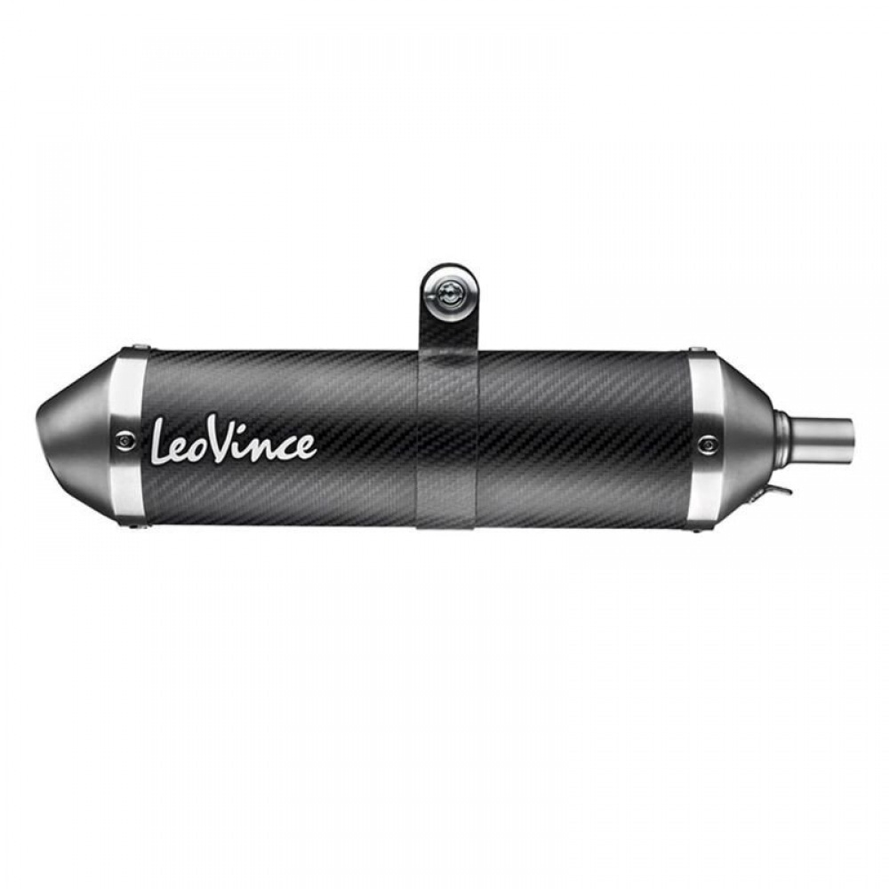 The full carbon housing consists of two layers of pre-impregnated carbon fiber. The silencer is very robust and at the same time very light, and above all it looks fantastic. The silencer clamp is also made of carbon. The sporty look is rounded off by the elegant LeoVince logo.