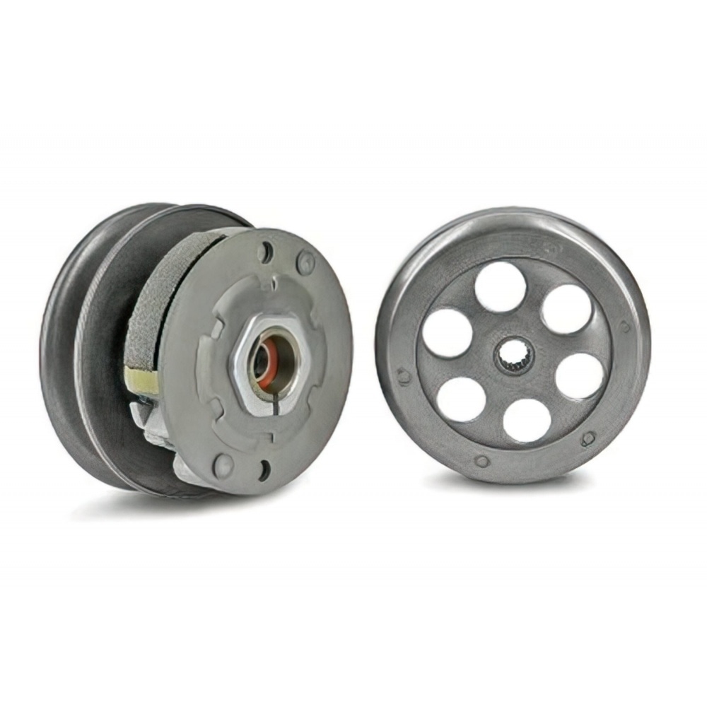 Rear Pulley complete with torque drive, clutch + clutcg bell for Minarelli before 1998 (with 105mm clutch). The pulley unit is identical to the stock part, just remove old pulleys and clutch, install this one, and you're good to. Good solution if you do not know which part of the pulley / clutch is not working properly. It saves you money to replace the entire unit, not just the individual components.