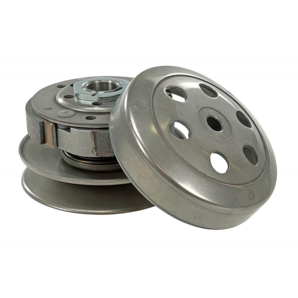 Torque Drive + Clutch + Bell Piaggio before 1999 / Peugeot / GY6. This rear pulley kit includesfthe ixed and movainghpulley halves andcthe lutch with matchingclutch bell , all of it in standard quality.