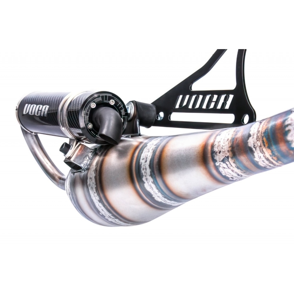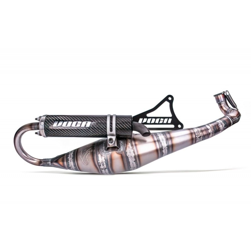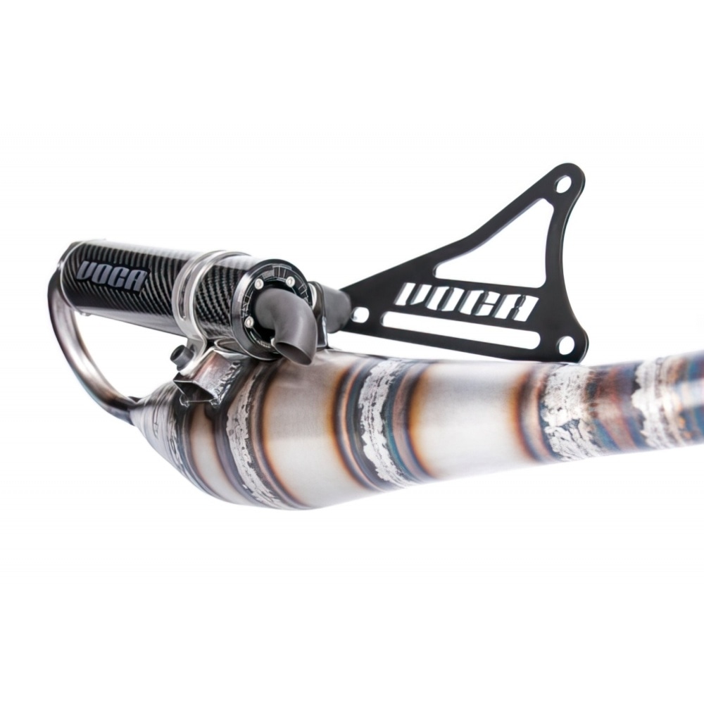 Voca Exhaust Road Race 70cc Carbon Minarelli horizontal (Yamaha Aerox etc.), top quality race exhaust for 70cc 2-stroke models with Minarelli horizontal engine. The body is hand-welded from 10 (!) 0.8mm thin steel cones, It comes with a stunning-looking carbon silencer - 100% Racing. Small parts for mounting are included, the exhaust is fixed with 3 screws. The bracket with laser-cut Voca logo is painted black.