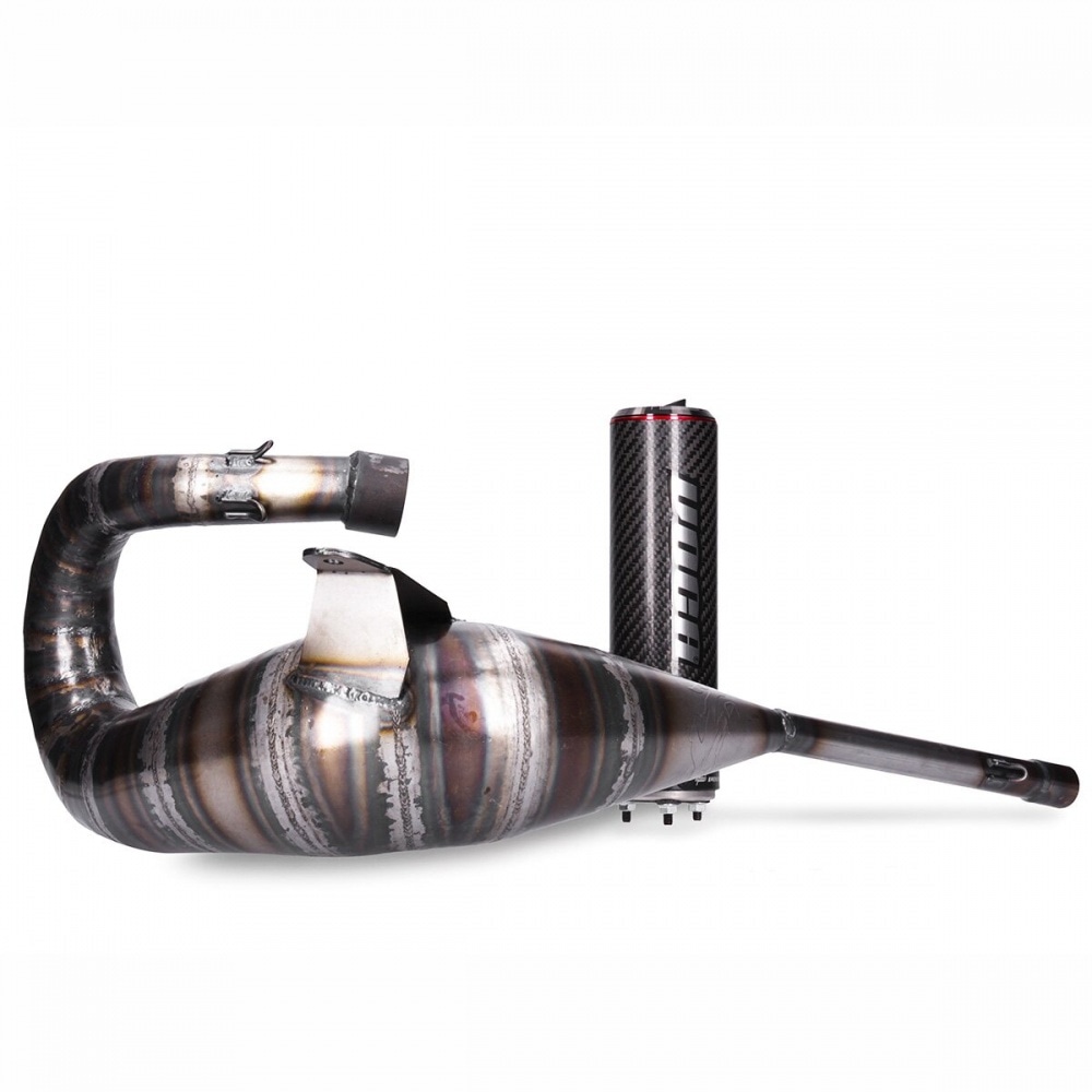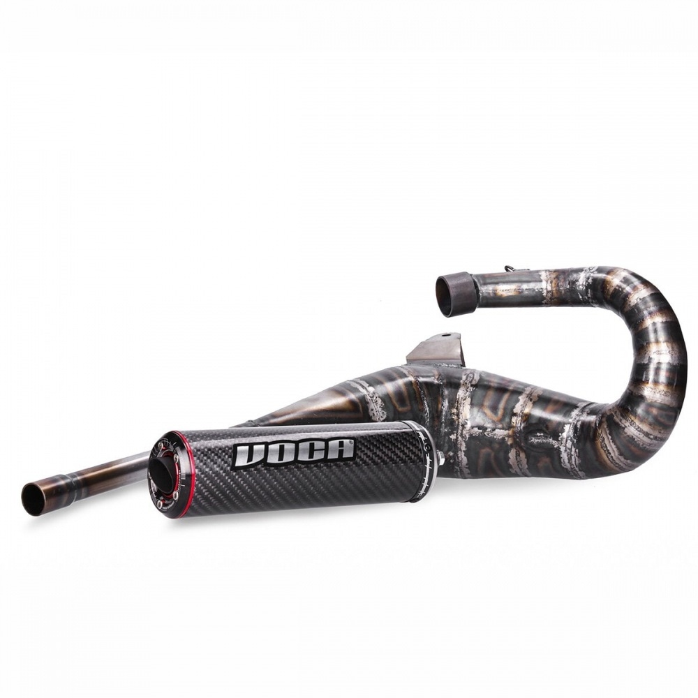 The classic expansion chamber is made of 18 (!!) hand-welded thin metal sheet cones and it comes with a carbon muffler with style disc and Voca logo.