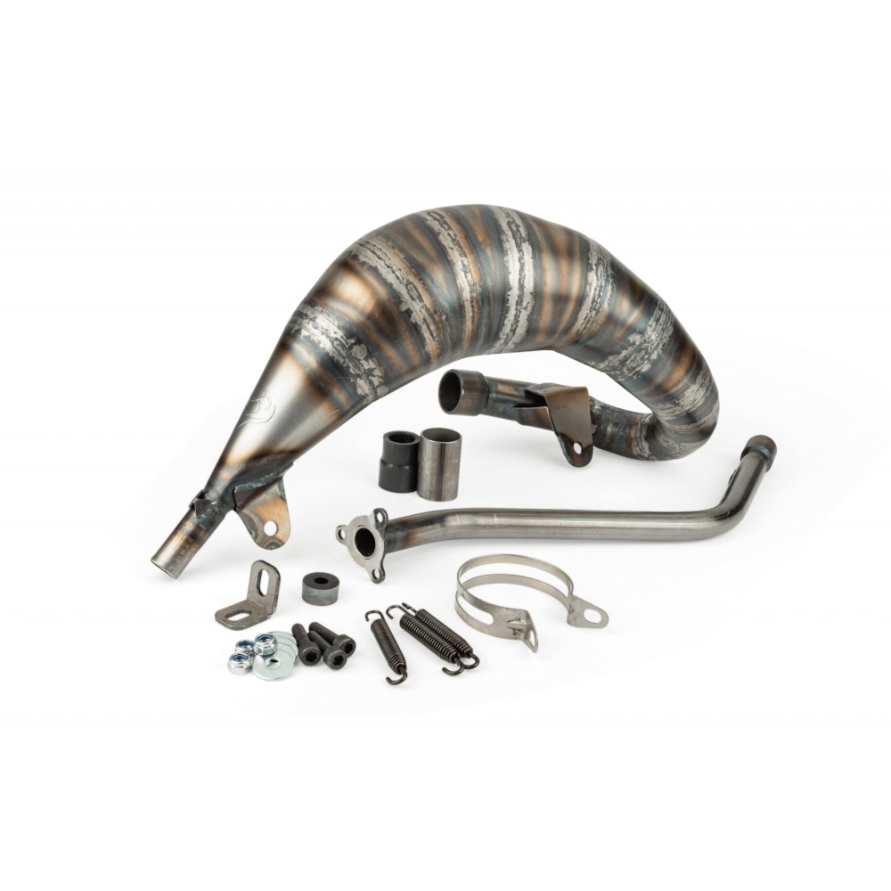 The Cross Carbon from Voca Racing is a classic segment-welded tuning exhaust for high-displacement 50cc supermotos / enduro bikes.