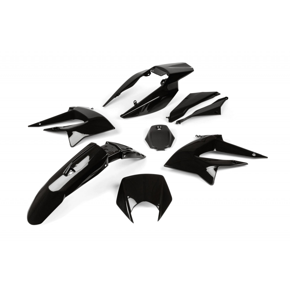 Fairing Kit 8 pcs. black Derbi DRD 2011 – 2017. The kit includes 8 top quality plastic panels so you can freshen up and change the look of your bike. The individual panels are similar to the original ones so you can mount them without any fuss and modifications.