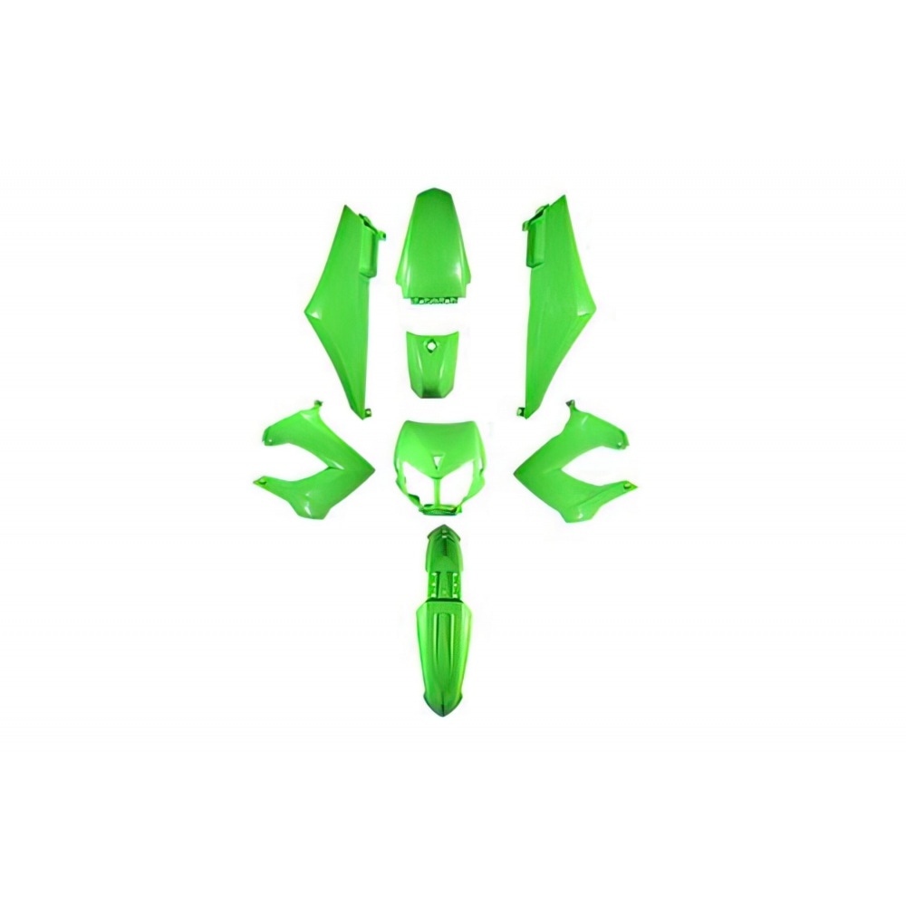 Fairing Kit 8 pcs. green Derbi DRD / X-Treme before 2011 (steel perimeter frame). The kit includes 8 top quality plastic panels so you can freshen up and change the look of your bike.The individual panels are similar to the original ones so you can mount them without any fuss and modifications.