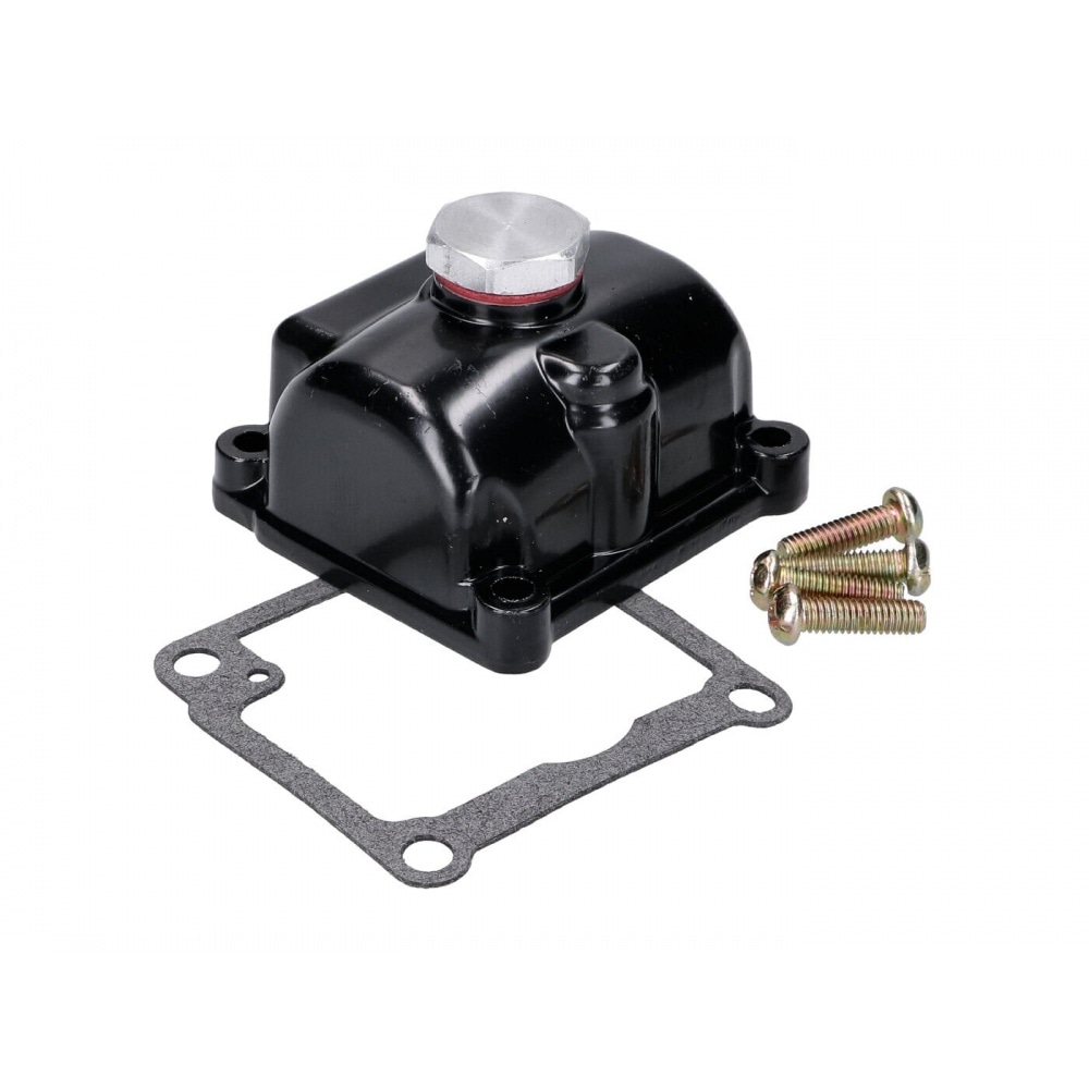 Practical and robust aluminium float chamber from Naraku for all type PHBG carburetors. The special feature of the float chamber is that you do not have to disassemble it to change the main jet. This is done by opening the central aluminium screw. To do this, the carburetor no longer needs to be dismantled, it is usually sufficient to turn it to the side.
