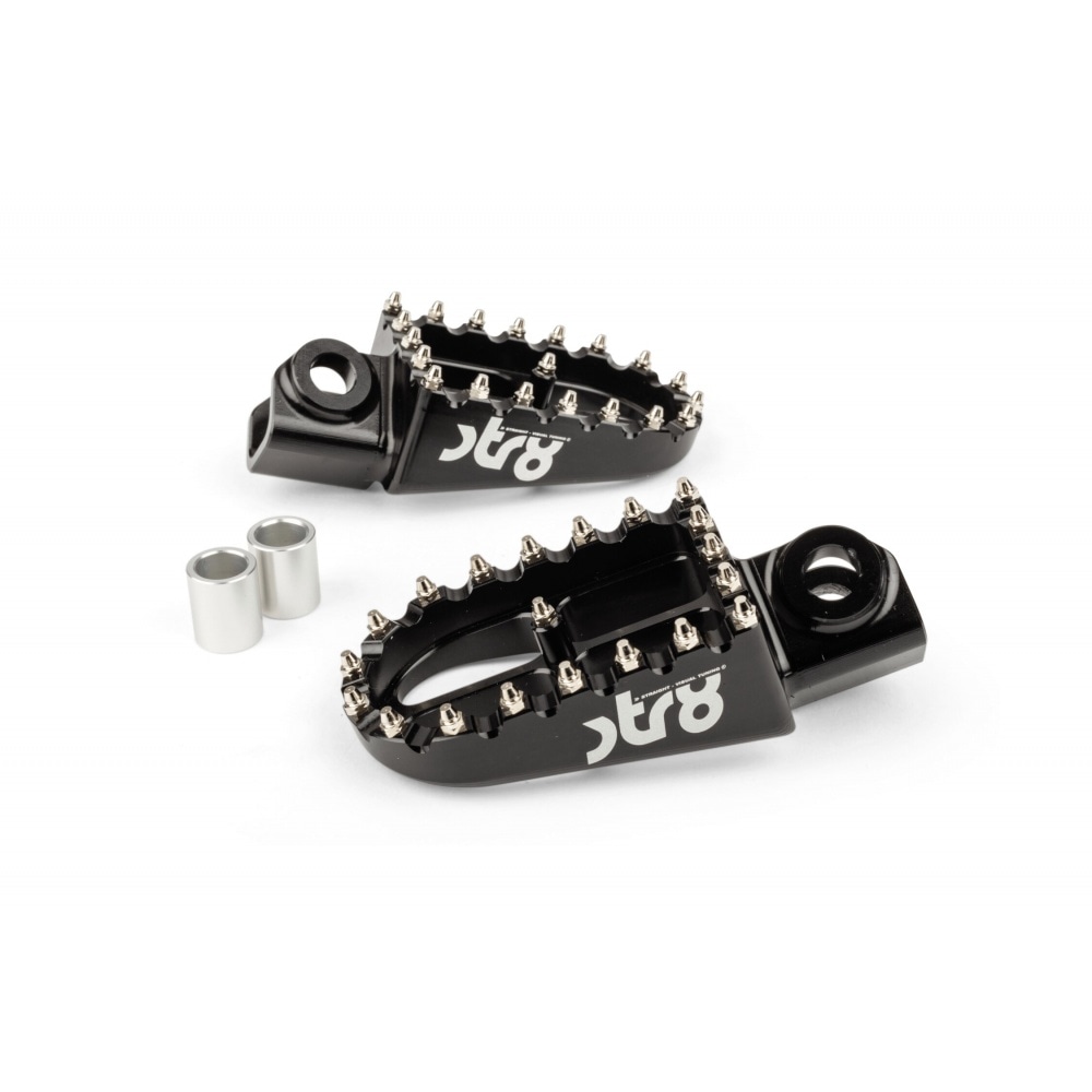 Plug and play fit for Rieju MRT, MRT Pro, MRX, Tango and Spike. The sharp motocross-style teeth provide excellent grip and noticeably better hold than the stock pegs—ideal for sporty riding.