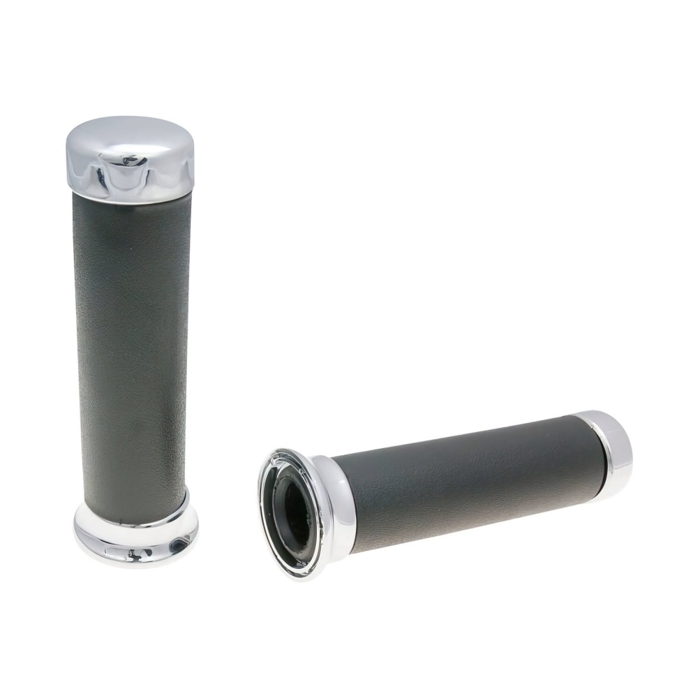 Grips Domino 2470 On-Road chrome end caps. Black, with fancy looking chrome end cap, universal fit.
