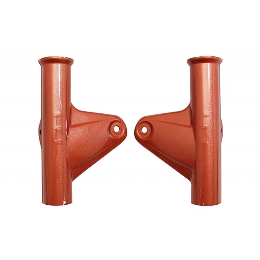 Headlight Mount red MBK 88 – 2x vintage look red holders for the headlamp of your Moby. The two pieces are mounted to the fork to hold the headlight which is attached with 2 hex head screws.