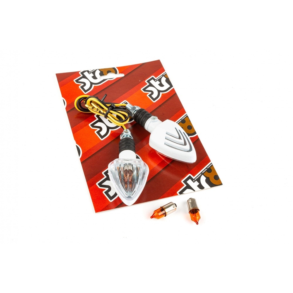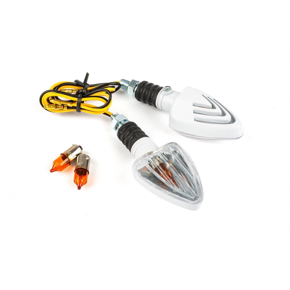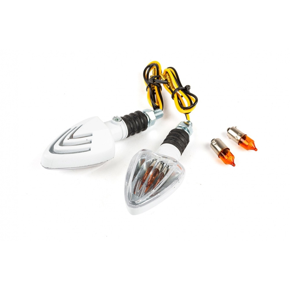 If you’re looking for new indicators that are not too showy but rather classy: Indicators Triangle short white / white. They are universal meaning they can be used on the majority of vehicles. White case and arm / white lens.