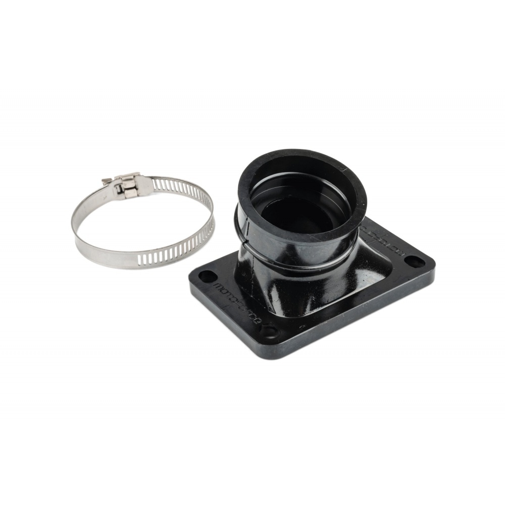 The MotoForce Racing intake manifold is made from a single piece of hard-density rubber, with 4 oblong holes for fitting to Minarelli AM6 and Derbi engines. This vulcanized rubber resists hydrocarbons and ensures excellent intake sealing. A reinforcement is integrated at the rear of the intake pipe to support the weight of PWK carburetors. This version has a 35 mm intake connection and is venturized to 24 mm, making it ideal for PWK carburetors from 19 to 24 mm.