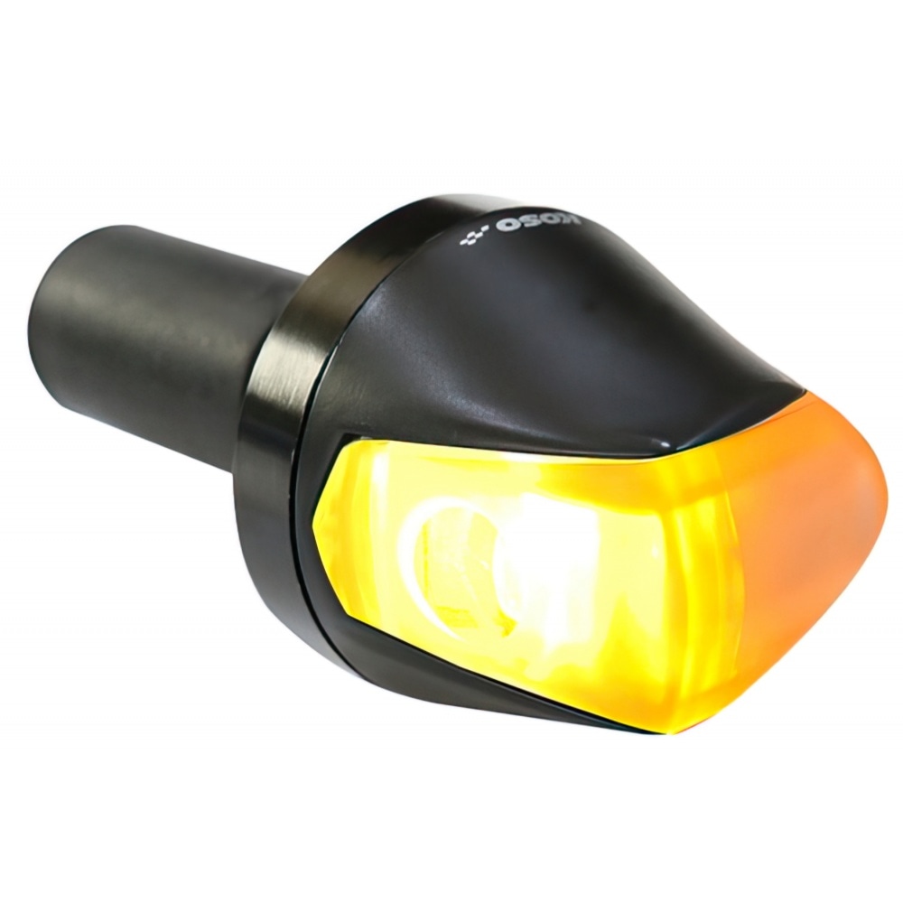 These Koso LED Indicators “Knight” with black metal housing and tinted smoke lenses are mounted to the ends of your handlebar (inside diameter 13mm – 22mm). They are street-legal / have CE approval.