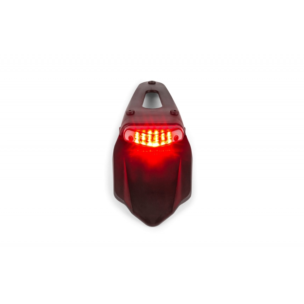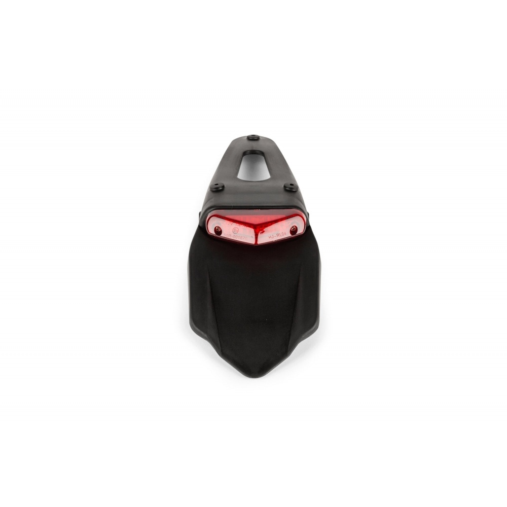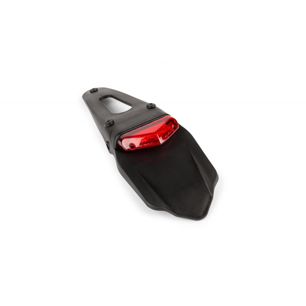 For supermotard / enduro bike models: License Plate Holder with tail light red 9 LEDs 50cc Supermoto CE. It’s basically a 3-in-1 product: license plate holder, rear mudguard and LED tail light. It is a universal model and can be mounted on lots of different bike models; it is fastened with 3 screws. Even better: it has two holes for mounting indicators.