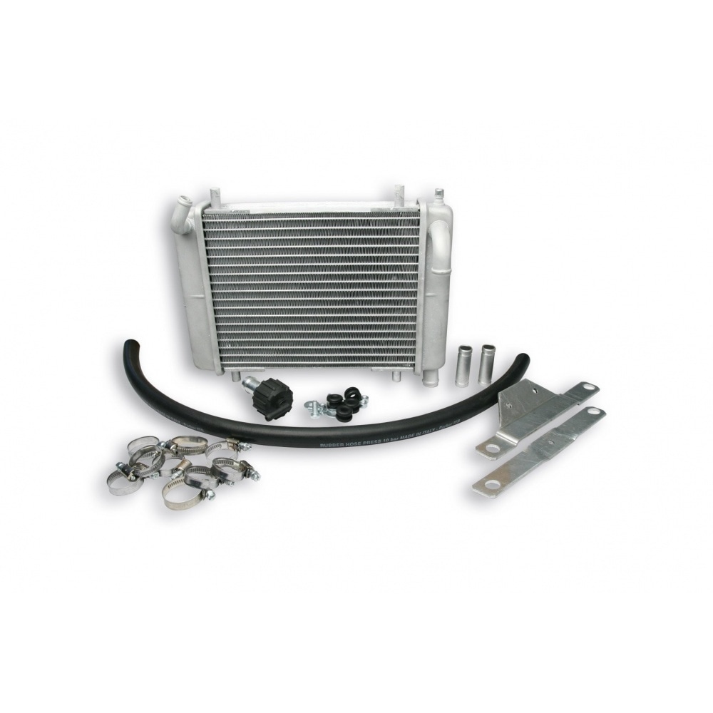 Malossi MHR Radiator large for Piaggio Zip SP before 2002, for powerful tuned / racing engines. The oversized tuning radiator with enlarged surface ensure stable and optimal temperatures even under extreme conditions (like racing). Quick and easy mounting, all small parts for installation are included (clamps, screws etc.0.