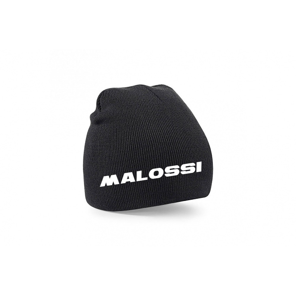 Fine knit beanie for Malossi fans, black with simple white Malossi lettering.