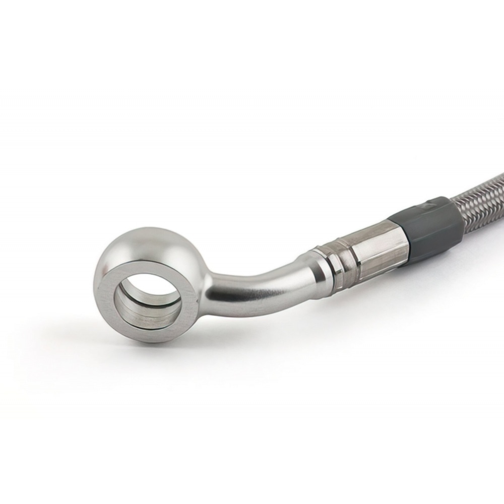 Motacc brake hoses are composed of a PTFE inner tube covered by a flexible stainless steel jacket. The hose is again covered by a transparent PVC coat. The banjo fittings are made of anodized aluminium; as they are freely rotating, mounting the hoses is very easy.