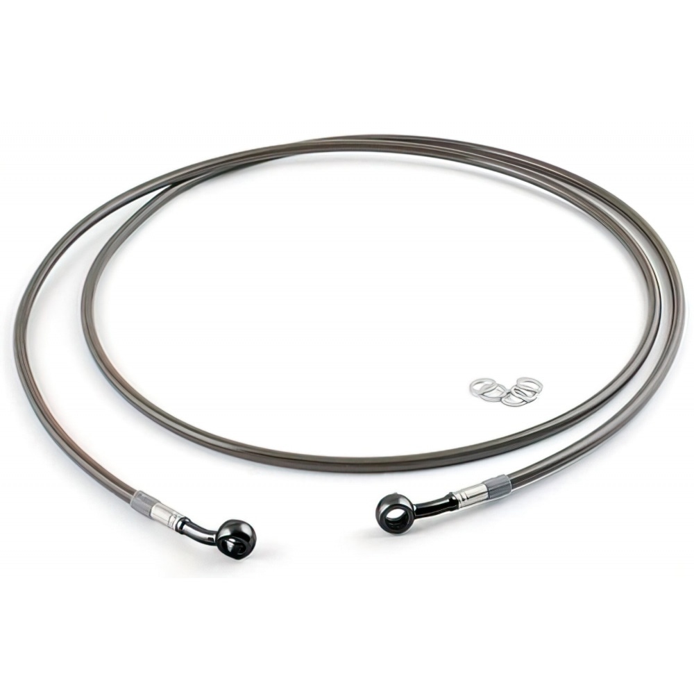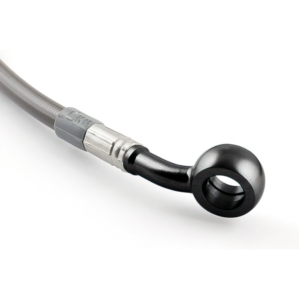 Motacc brake hoses are composed of a PTFE inner tube covered by a flexible stainless steel jacket. The hose is again covered by a transparent carbon-look PVC coat. The banjo fittings are made of anodized aluminium; as they are freely rotating, mounting the hoses is very easy.