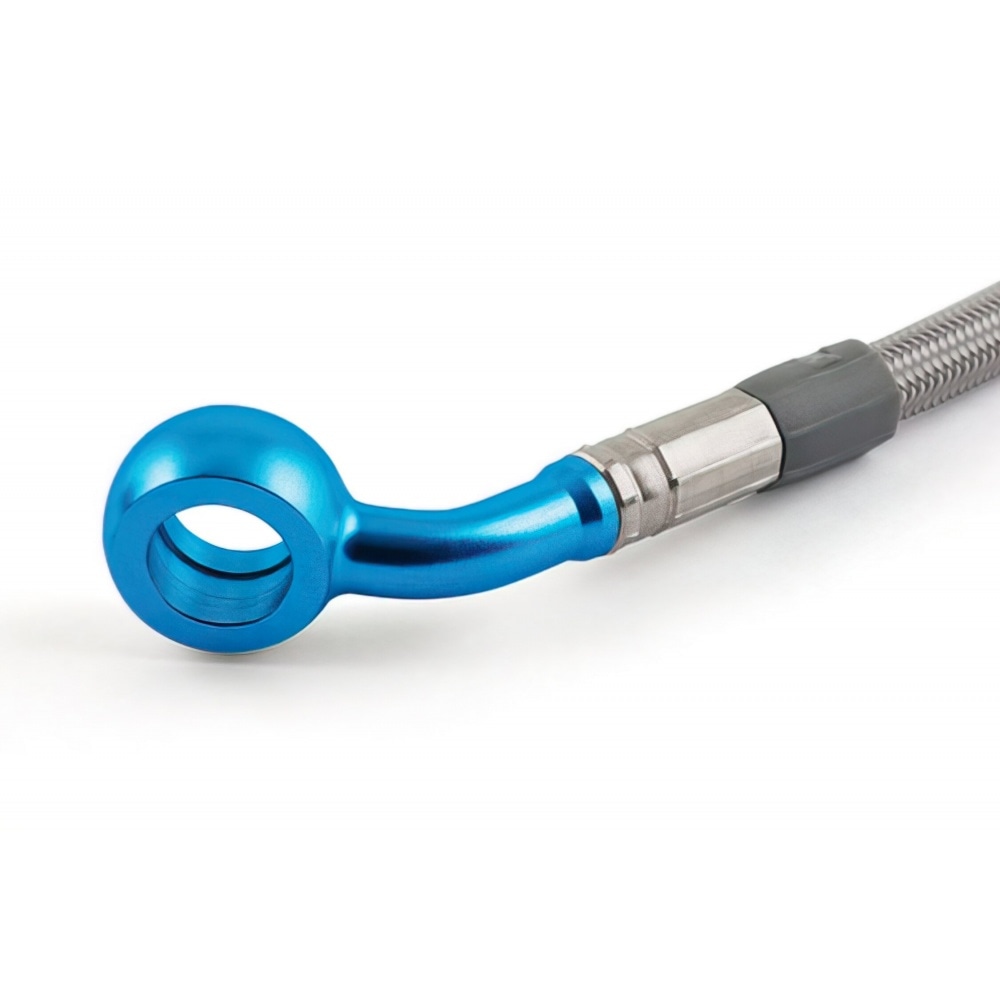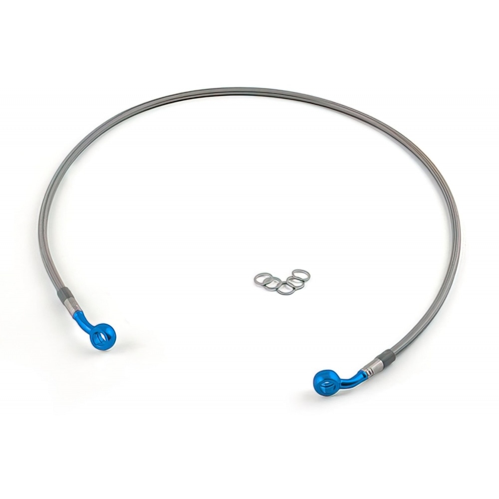 Motacc Brake Hose (rear) MBK Nitro / Aerox stainless steel w/ blue banjo fitting – braided stainless steel brake lines for maximum braking performance – and to add a sleek racing look to your bike.