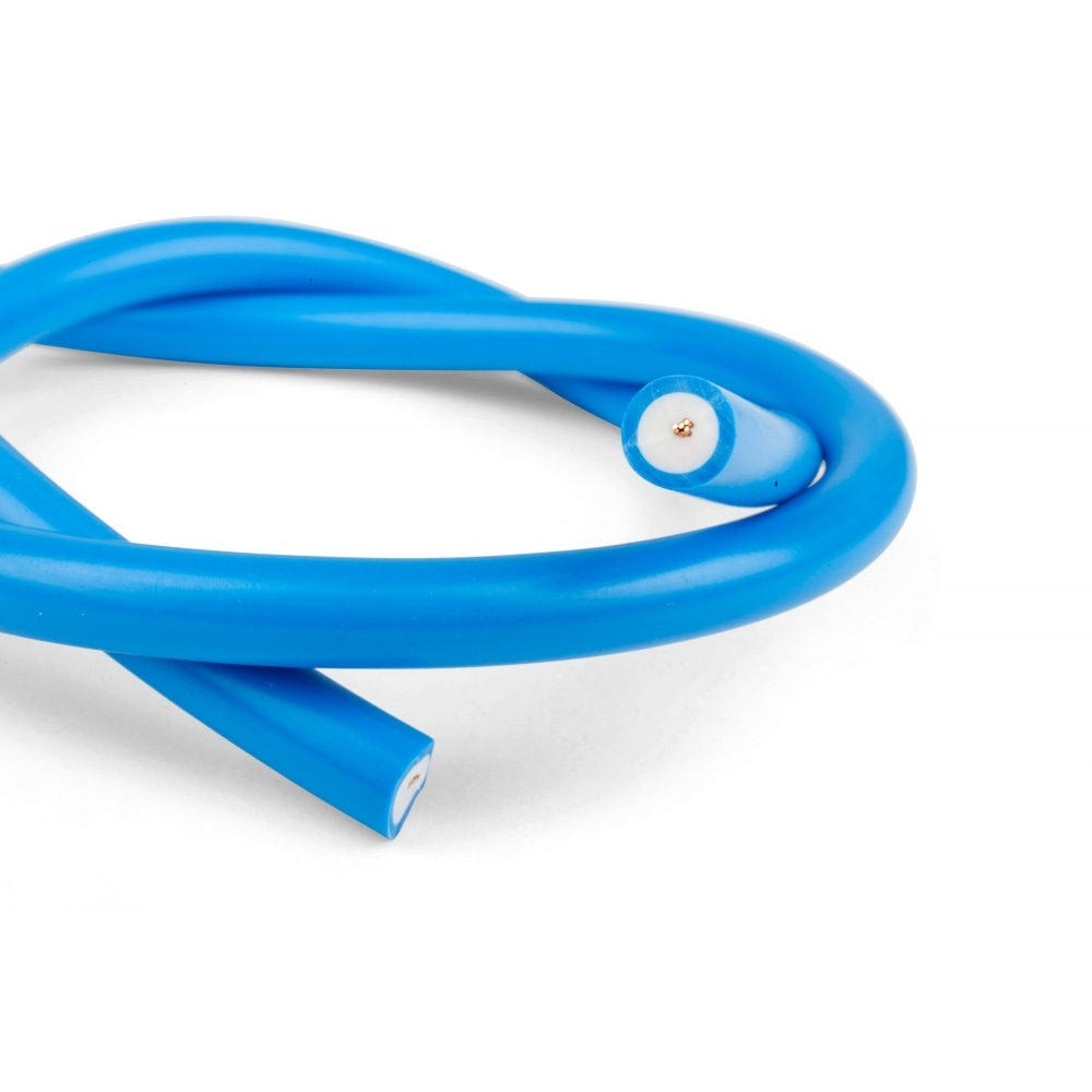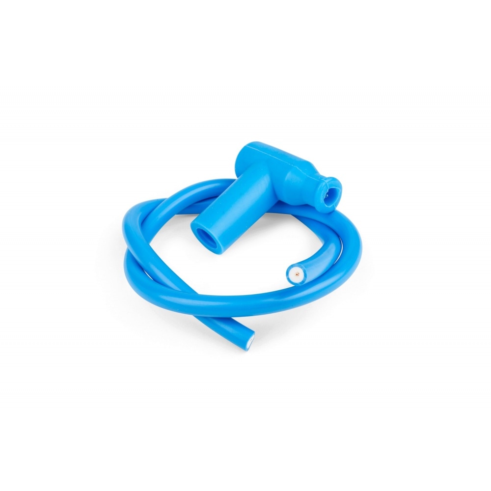 The spark plug wire consists of a 50 cm-long copper cable. This cable is surrounded by an insulating material designed to prevent electrical interference. The whole assembly is protected by a layer of blue silicone. The suppressor, at a 90-degree angle, is then encapsulated in water- and moisture-resistant insulating rubber.