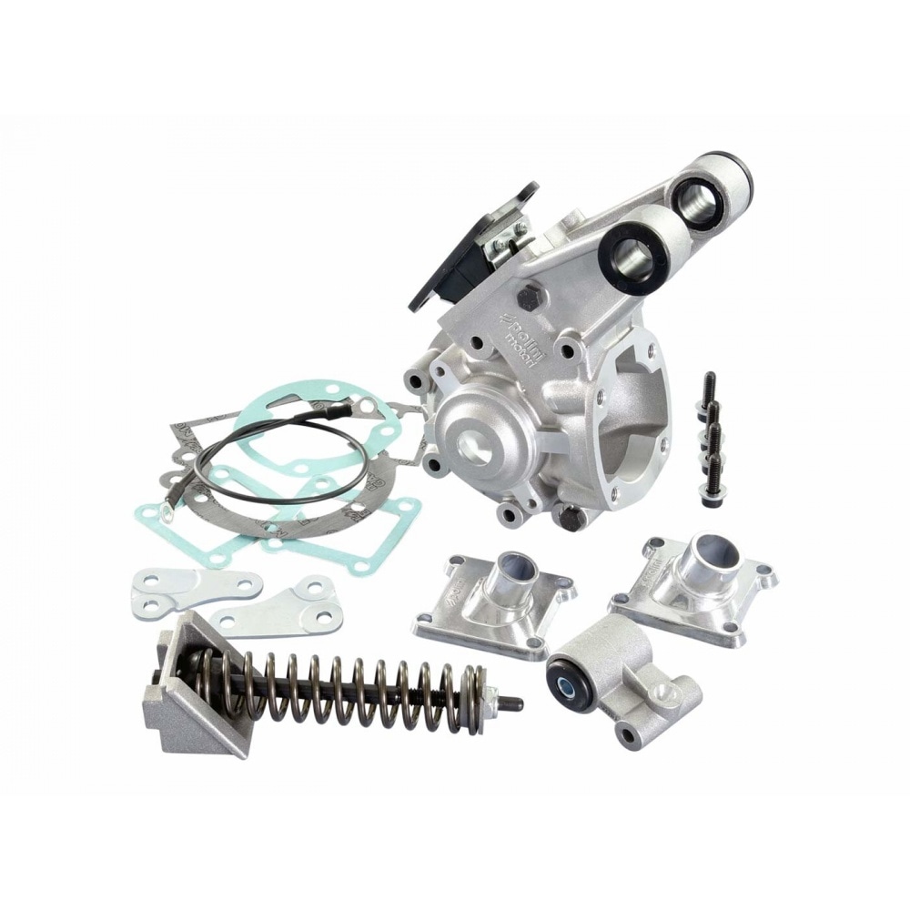 Complete Crankcase Polini empty Peugeot 103 with spring mounted engine support / engine spring and 2 intake manifolds. Without bearings and oil seals.