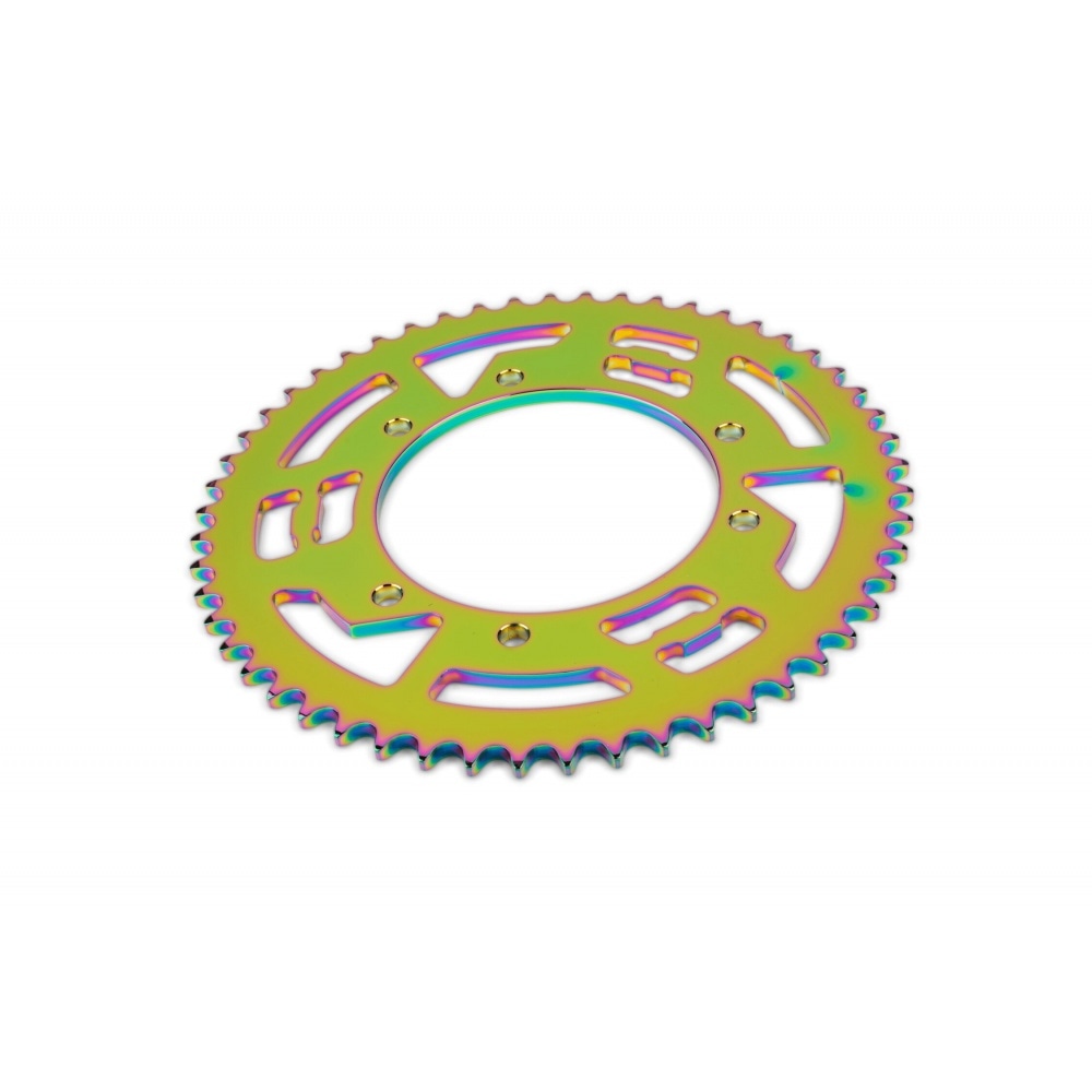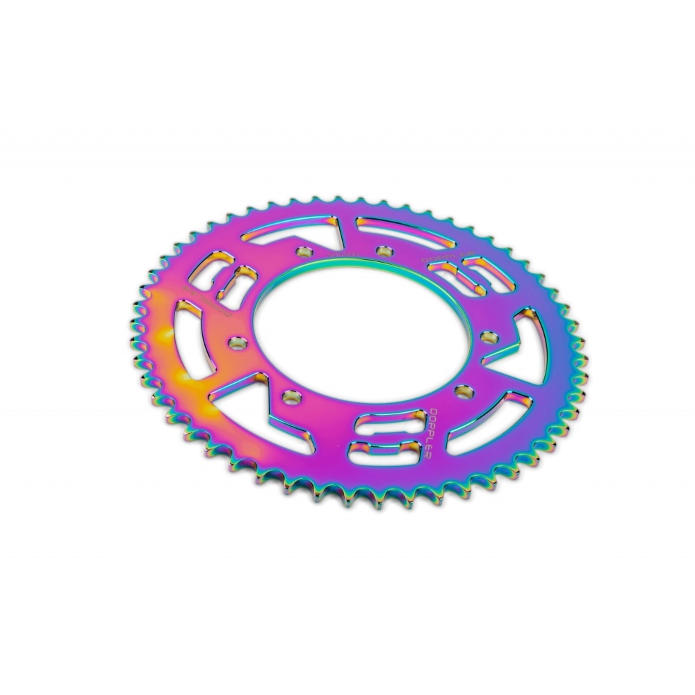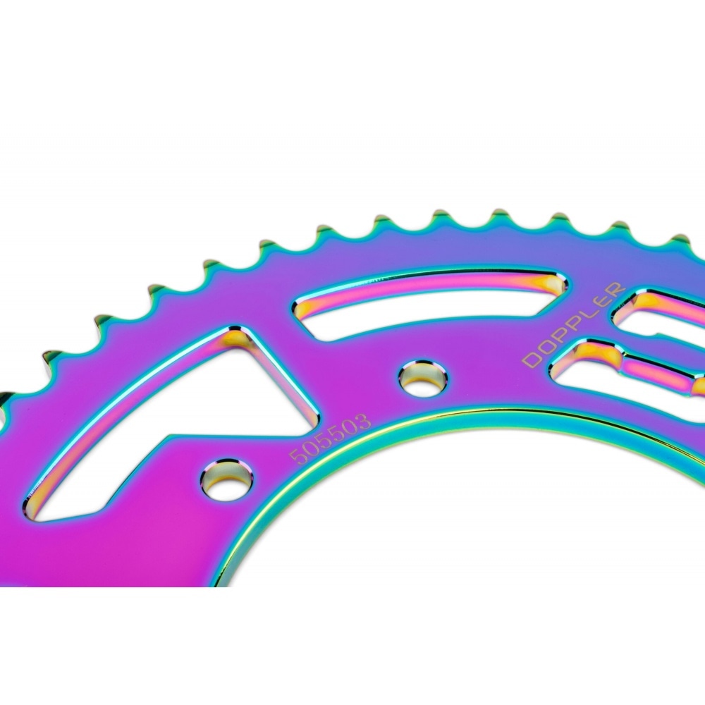 Rear Sprocket 53 teeth – 420 Doppler Alu CNC Neochrome Derbi Senda / Rieju MRT, great looking replacement for original sprocket. Suitable for racing set-ups. The chainring is made of extra lightweight aluminium which will help improve acceleration. The anodized coloured finishing will add a bit of customizing to your wheels.