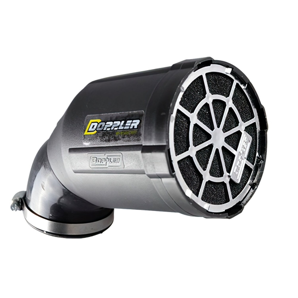 Air Filter d.48mm Doppler Air system black case / black foam / chrome grille. Air filter with Venturi Air System for PWK carburetors with small diameter. The Doppler Venturi Air system draws air into a resonance chamber via a venturi insert. The additional resonance chamber reduces gas oscillation and intake noise, the carburetor runs more smoothly and adjusting your carburetor becomes easier. Due to the slightly modified intake path, the air filter is now even quieter.