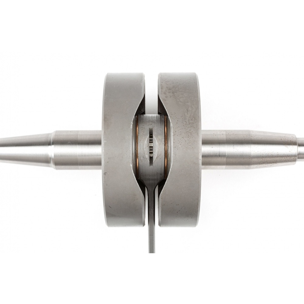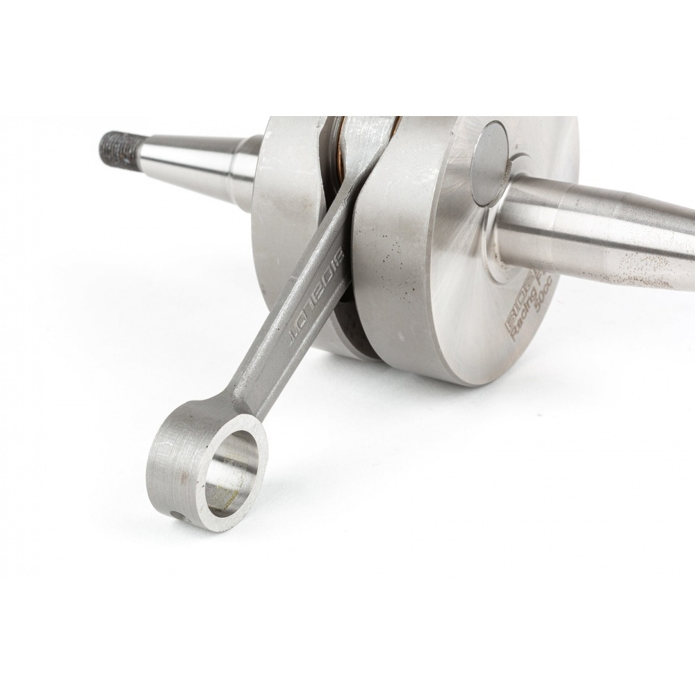 The racing crankshaft with 85mm connecting rod for 39,7mm stroke was developed especially for the RF50WR cylinder kits and is without any doubt a top-notch performance part. The connecting rod is forged, with CNC-finishing for ultimate precision. The big end bearing was manufactured especially for Bidalot and, like the special narrowed down connecting rod, has slightly modified dimensions; the crankpin fits more snug into the crankwebs, which leads to increased rigidity. Balancing is perfect, the bearing is silver-plated and the thrust washers are bronze-plated.
