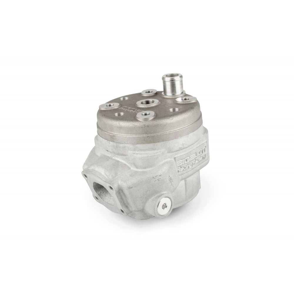 The Nikasil-coated aluminum cylinder has 6 transfer ports and a boost port supported exhaust. Bidalot developed complete new transfer and exhaust ports to perfectly match the Ø47.6mm bore. The objective was to provide very high power at high rpm, but without compromising torque and mid-range performance.