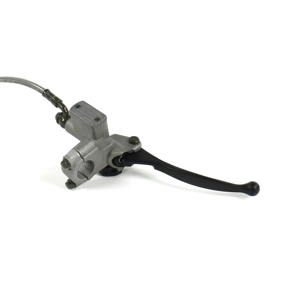 Brake Kit front 2 pistons Hix Pit Bike / Dirt Bike red. Brake kit complete with brake cylinder, brake caliper (2 piston) and braided steel brake line (1100mm). A bracket to attach the brake to the swing arm is also included.