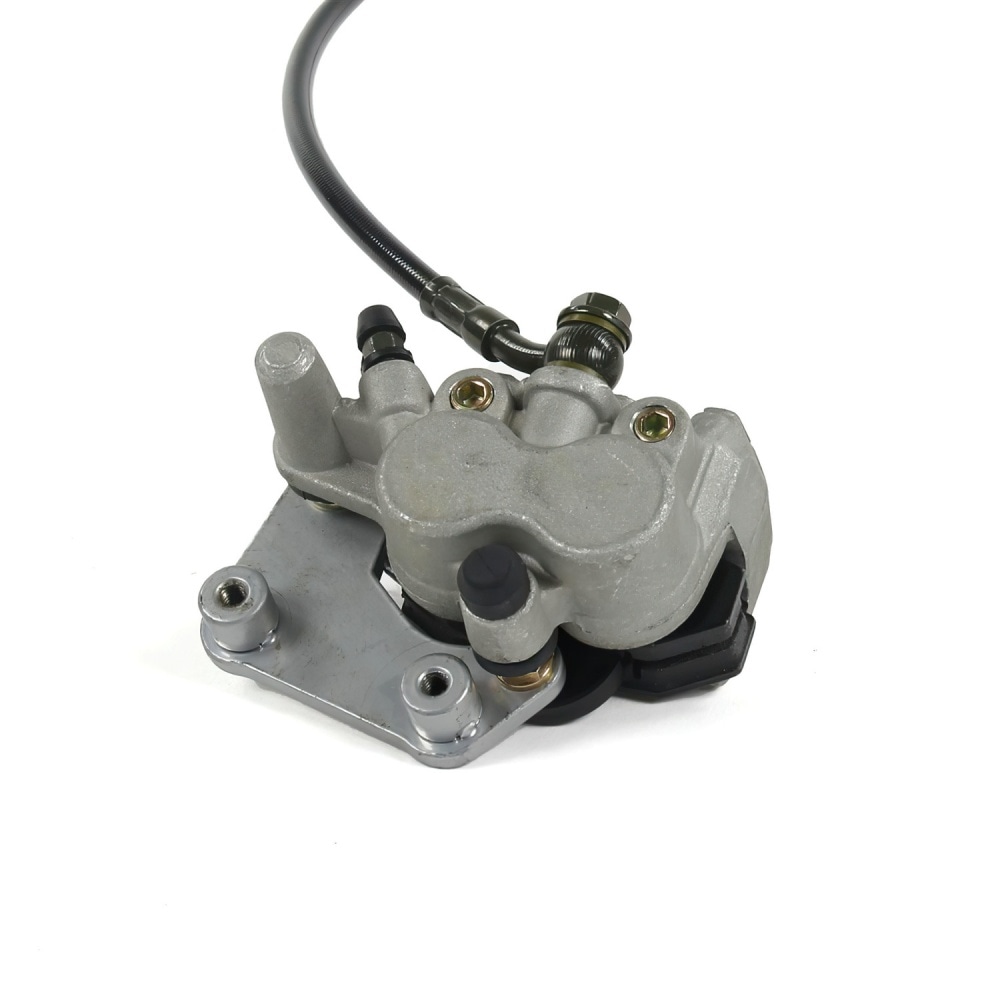 Brake Kit front 2 pistons LT-F888 Pit Bike / Dirt Bike. Brake kit complete with brake cylinder, brake caliper (2 piston) and braided steel brake line (1100mm). A bracket to attach the brake to the swing arm is also included.