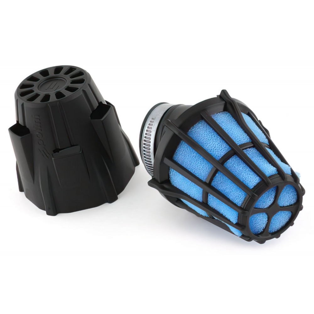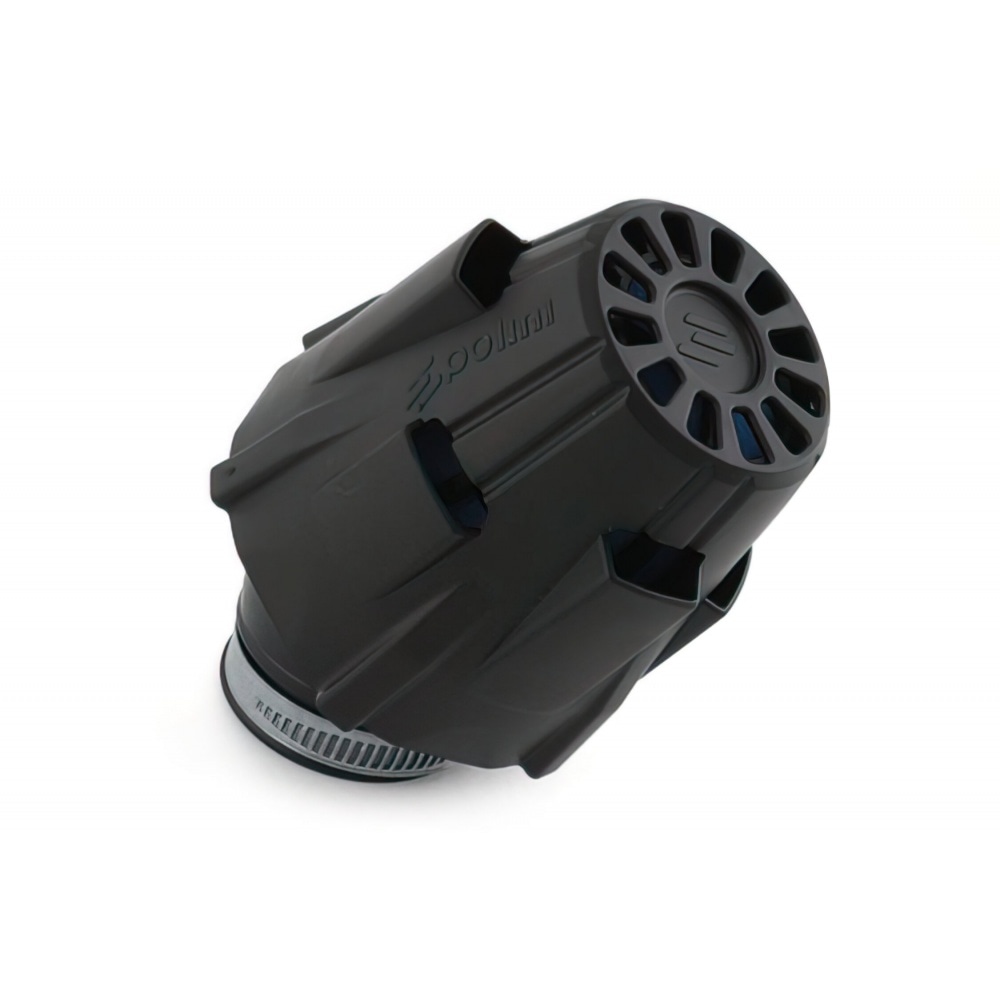 Polini Air Filter “Air Box” black 30° angle 46mm. The HQ open cell foam provides excellent filtration; the box it is sitting in will protect your air intake system against water and will also keep the air intake noise down.