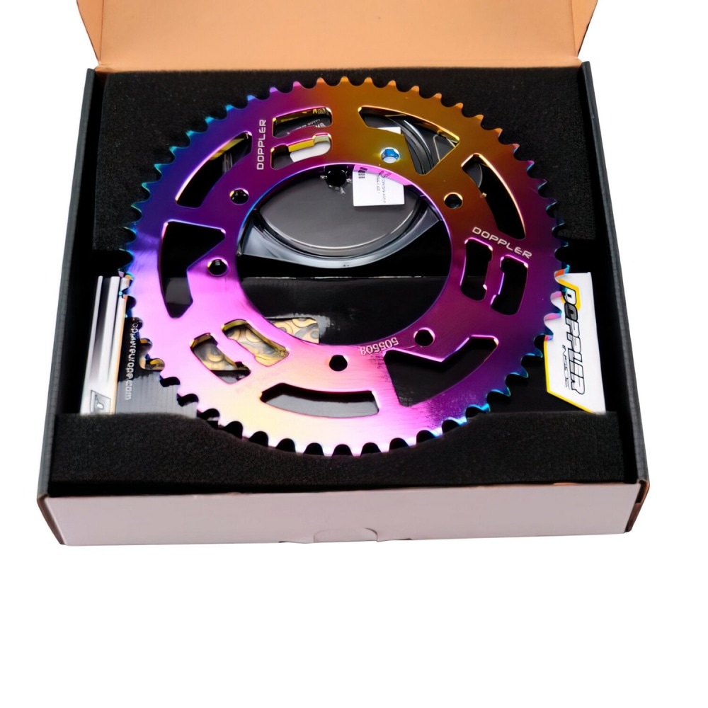 Chain Kit aluminium Neochrome 14×53 – 420 Doppler Derbi Senda Sm / Xtrem, great looking replacement for original chain and sprockets. Suitable for racing set-ups. The chainring is made of extra lightweight aluminium which will help improve acceleration. The anodized coloured finishing will add a bit of customizing to your wheels.