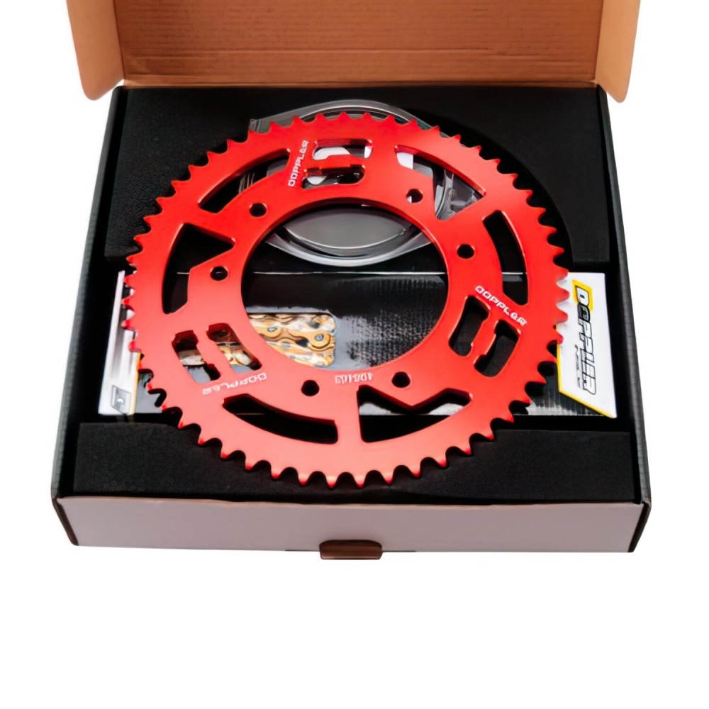 Chain Kit aluminium red 14×53 – 420 Doppler Derbi Senda, great looking replacement for original chain and sprockets. Suitable for racing set-ups. The chainring is made of extra lightweight aluminium which will help improve acceleration. The anodized coloured finishing will add a bit of customizing to your wheels.