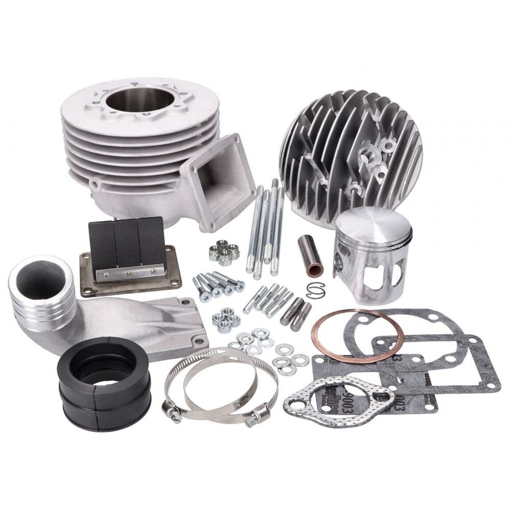 This is the Polini Evolution cylinder with reed valve supported intake. The large reed valve with 0.4mm petals and the intake manifold are designed for use with 34mm carburetors and ensure that cylinder filling is optimal at all times. The cylinder with divided exhaust port is an enhanced development of the Evolution 133, with a 60mm bore and a displacement of 152cc. This means that you can reach 30 hp on the condition you add the right components. The cylinder sets new standards for road or race track.